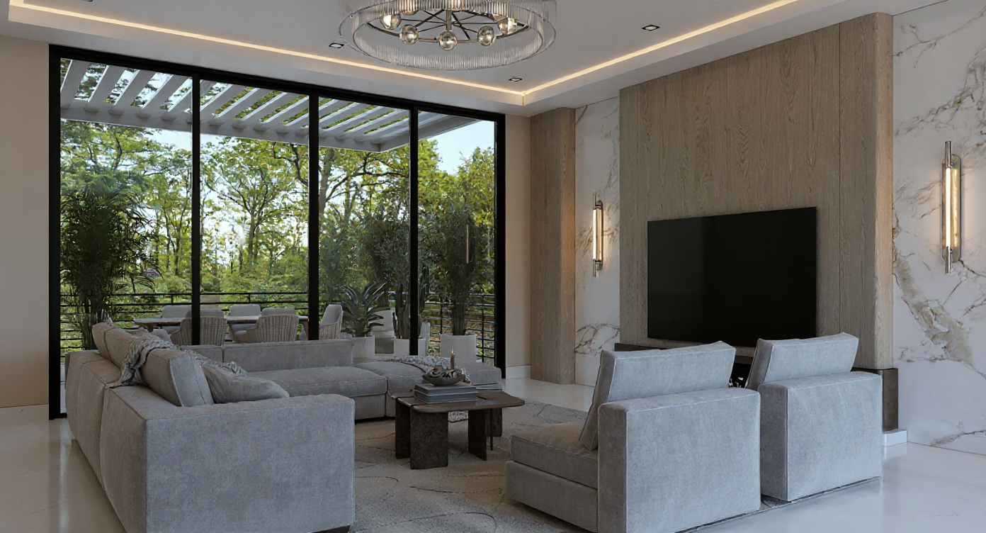 change patio to bluestone pavers change driveway to granite cobbles no plants on driveway change white stucco to gray siding make wood garage doors darker add lush fall landscape in background add plantings to grass areas change roof to gray wood shakes make gable on garage light gray siding add tree in front left foreground add potted plants and a bench to front patio add a short courtyard wall between driveway and patio change siding color to dark gray change gable above garage door to dark gray siding architecture