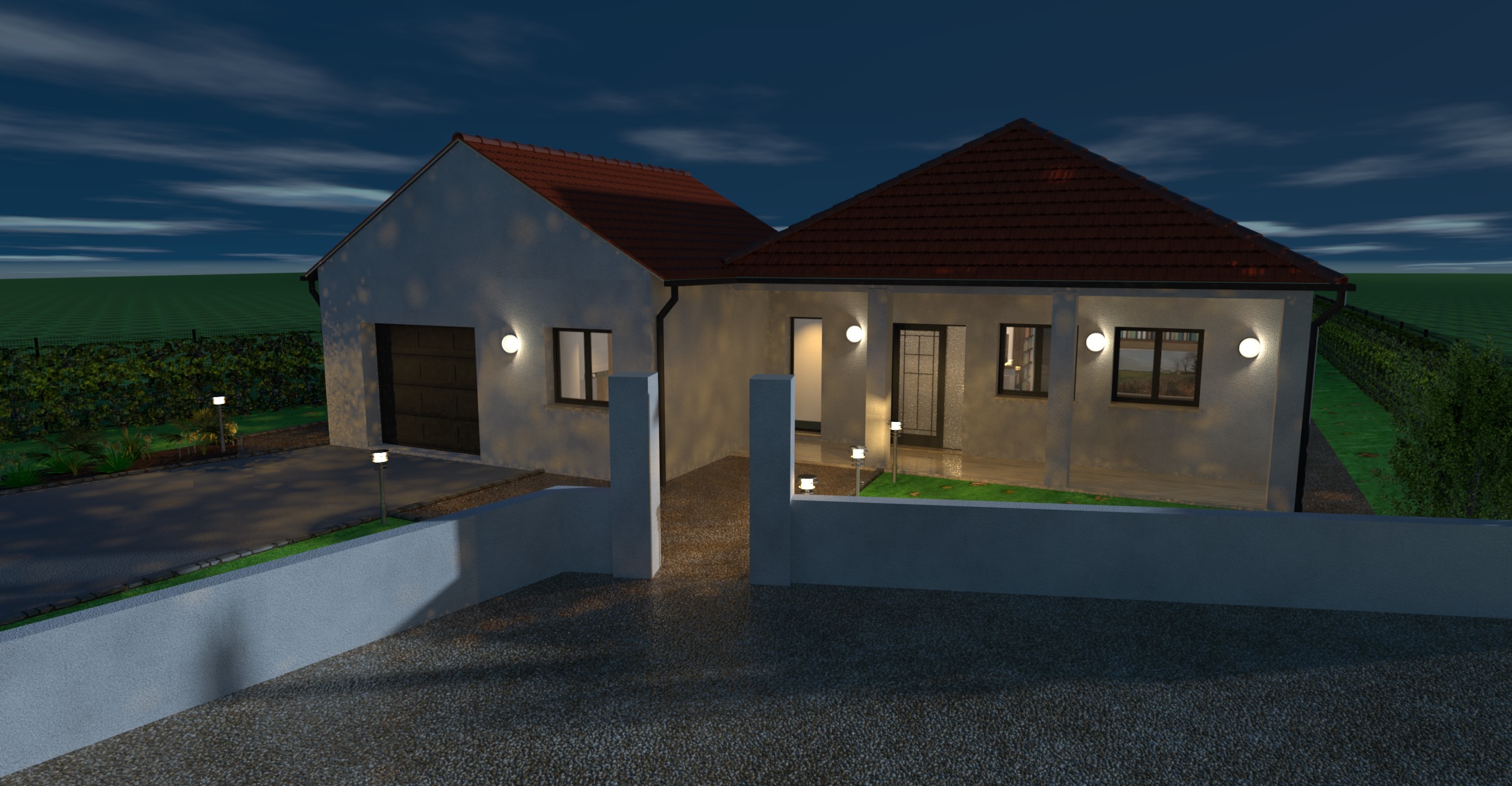 transforme ce rendu 3d issu d archicad en image d architecture photor aliste haut de gamme cr dible naturelle et professionnelle destin e un usage commercial objectif produire un visuel de qualit architecte premium r aliste rassurant et vendeur comme une image de commercialisation immobili re haut de gamme consigne prioritaire absolue conserver strictement le projet tel qu il appara t sur le rendu 3d d origine sans aucune r interpr tation architecturale pr server int gralement l implantation exacte du b timent l architecture les volumes et les proportions la forme de la toiture et les d bords les ouvertures menuiseries portes baies et garde corps les terrasses murets cl tures escaliers et l ments ext rieurs la perspective le cadrage la hauteur de cam ra et l angle de vue la composition g n rale du projet interdictions absolues ne pas modifier la conception ne pas d placer la maison ni aucun l ment construit ne pas ajouter d l ments architecturaux invent s ne pas supprimer d l ments pr sents sur le rendu ne pas changer les proportions la pente de toiture ou la taille des ouvertures ne pas produire un rendu trop cg artificiel sursatur ou irr aliste travail attendu apporter uniquement un niveau de r alisme photographique sup rieur par le traitement des mati res de la lumi re de l environnement et de l ambiance qualit de rendu recherch e photor alisme architectural premium lumi re naturelle coh rente et physiquement cr dible ombres r alistes douces ou marqu es selon l heure indiqu e textures pr cises la bonne chelle mat riaux cr dibles et haut de gamme profondeur contraste et nettet ma tris s ambiance l gante sobre non surcharg e rendu naturel sans exc s d effets environnement int grer avec r alisme terrain fid le la sc ne pelouse naturelle non artificielle v g tation cr dible sobre et coh rente avec le lieu mat riaux ext rieurs r alistes ciel naturel arri re plan coh rent avec le projet champ lotissement arbres route environnement r el ambiance commerciale recherch e le visuel doit inspirer confiance donner envie d acheter et valoriser le projet sans le d naturer le r sultat doit voquer une vraie photographie d architecture prise par un photographe professionnel r alisme technique indispensable reflets subtils et coh rents sur les vitrages ombres port es logiques l ger relief et micro textures sur les mat riaux imperfections discr tes et naturelles pour viter l effet synth tique v g tation cr dible en densit en couleur et en implantation perspective rigoureusement respect e style visuel sobre l gant premium architectural cr dible lumineux naturel commercial aucun effet tape l il aucune surcharge aucun l ment d coratif inutile sortie souhait e image finale en tr s haute d finition rendu net propre vendeur r aliste avec qualit de pr sentation professionnelle pour dossier client publicit ou commercialisation rappel final tu dois am liorer uniquement le r alisme visuel jamais modifier le projet architectural ajouter un portillon entre les poteaux de la cl ture teindre les applique de la fa ade