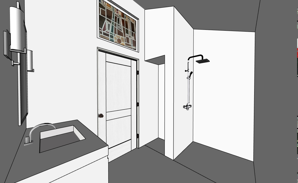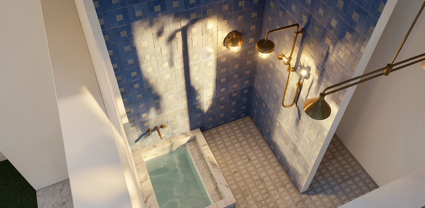 photorealistic image of a bright coastal style bathroom interior full height backsplash walls inside shower and behind vanity vertically oriented rectangular ceramic tiles approximately 4x12 proportion laid in a perfect grid with crisp white grout lines tiles rendered in light to medium gray green with subtle texture shading to show the vertical orientation and slight sheen brass shower fixture with a clear shower glass door large terrazzo tile in light tone flooring solid wood cabinetry in medium dark wood tone with visible straight grain and matte finish thick white marble or quartz slab with very subtle veining polished surface right white with soft gray shadows underneath the overhang