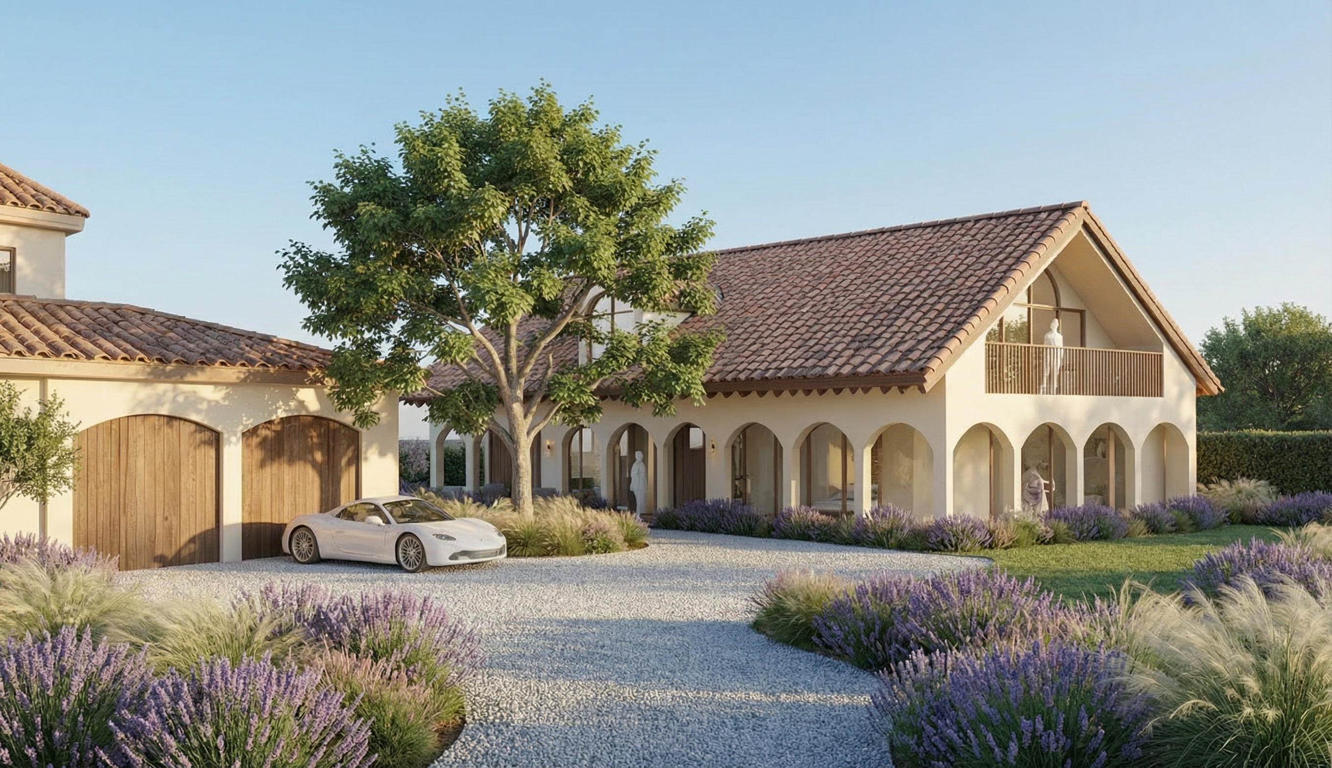 replace front portion of driveway with more soft grasses and mediterranean shrubs
