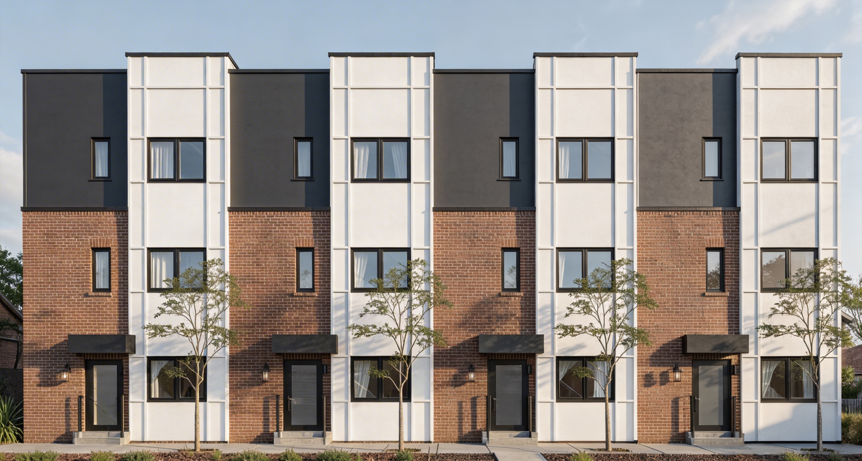 cedar dark wood vertical paneling at the front matte black metal paneling on the side black railing and black balcony and poles black trim on doors and windows