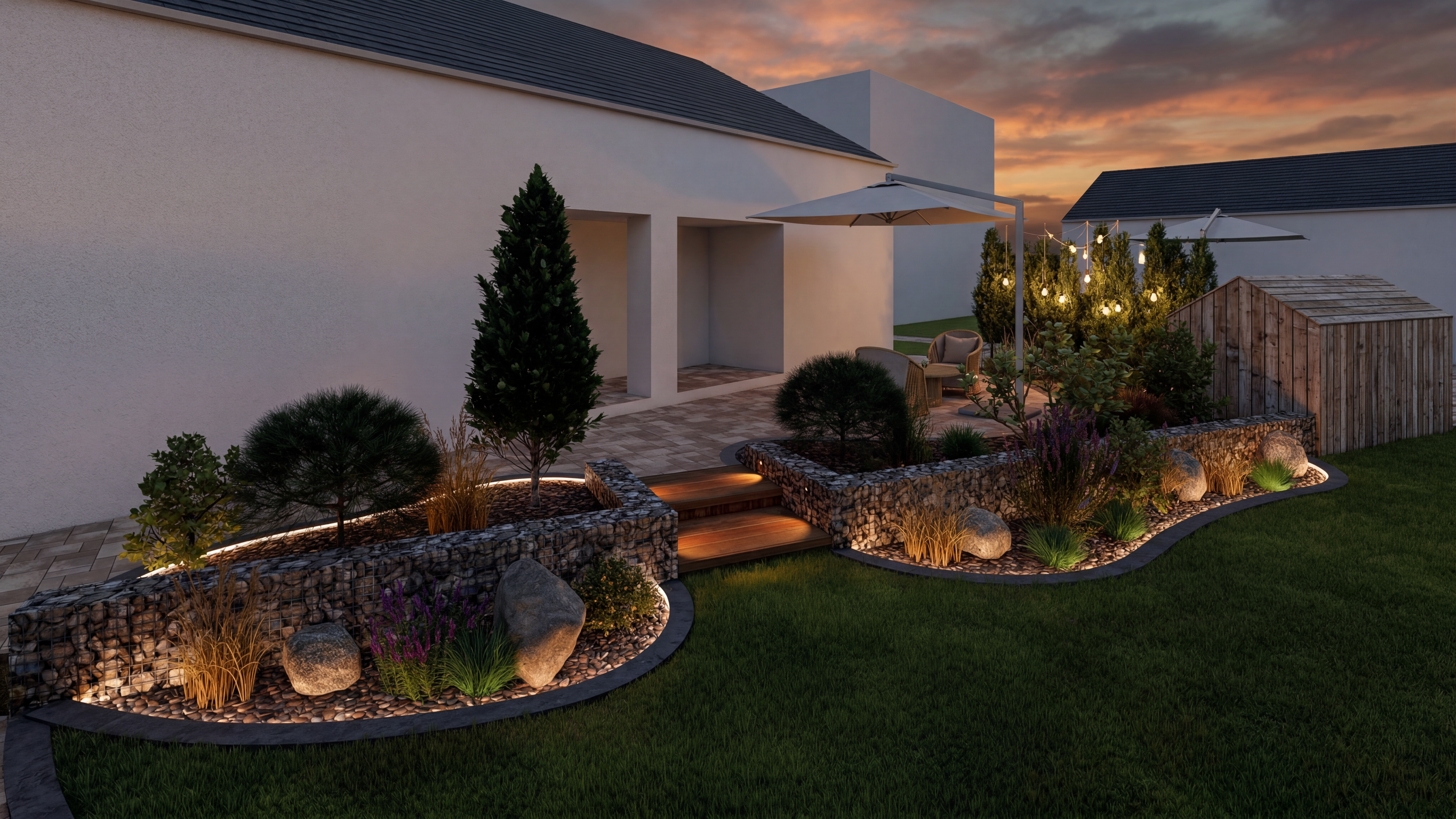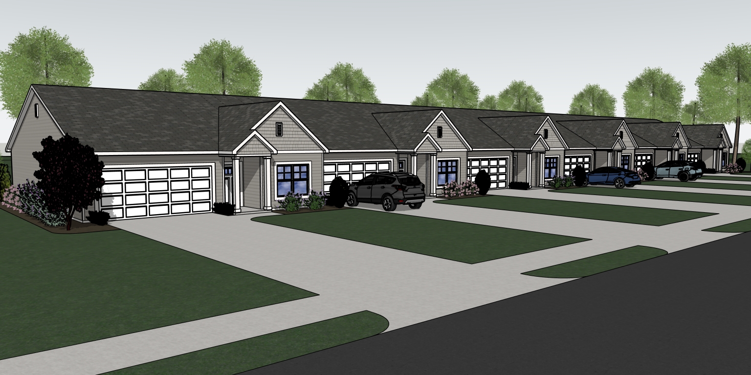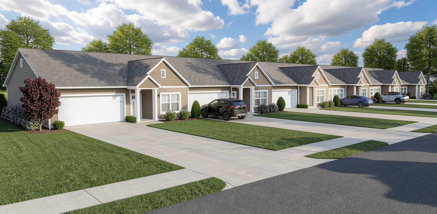 partly cloudy sky some deciduous trees in background add gutters white windows taupe siding paved concrete driveway