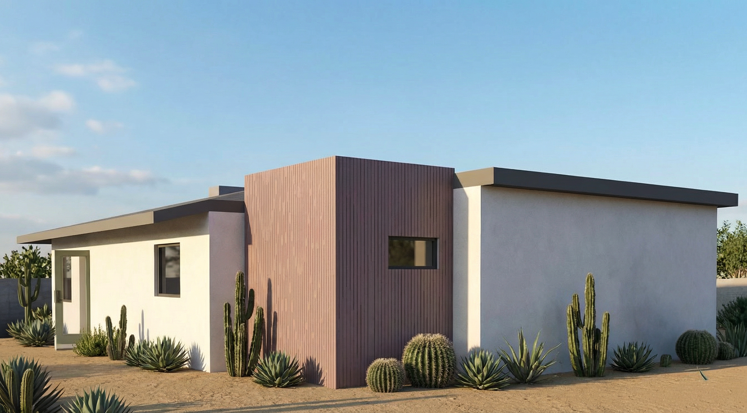 all exterior tones are mauve change the white exterior stucco to match the tone of the vertical slats