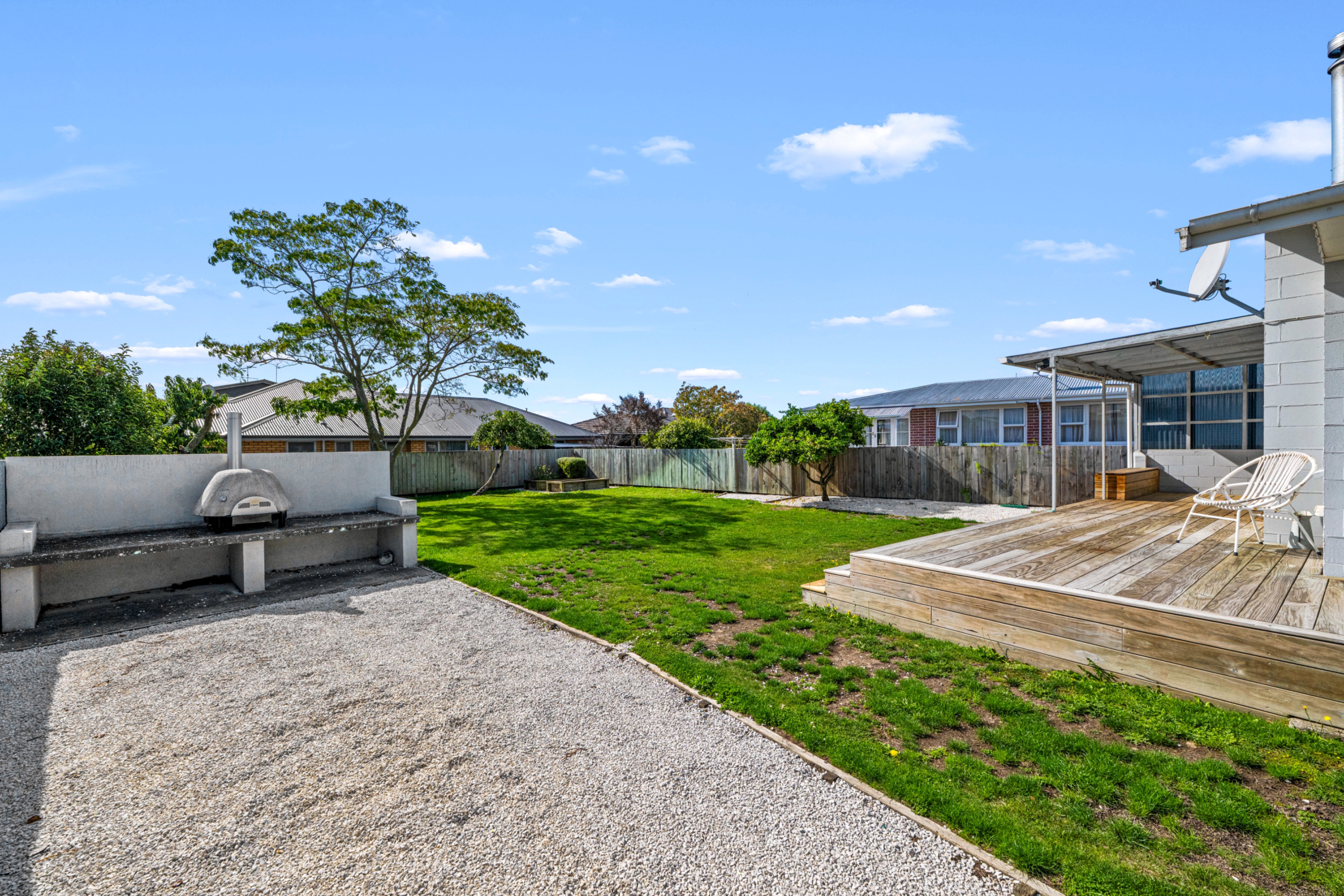 stage pizza oven area with outdoor table stage bench by oven nothing blocking deck stairs small couch on deck