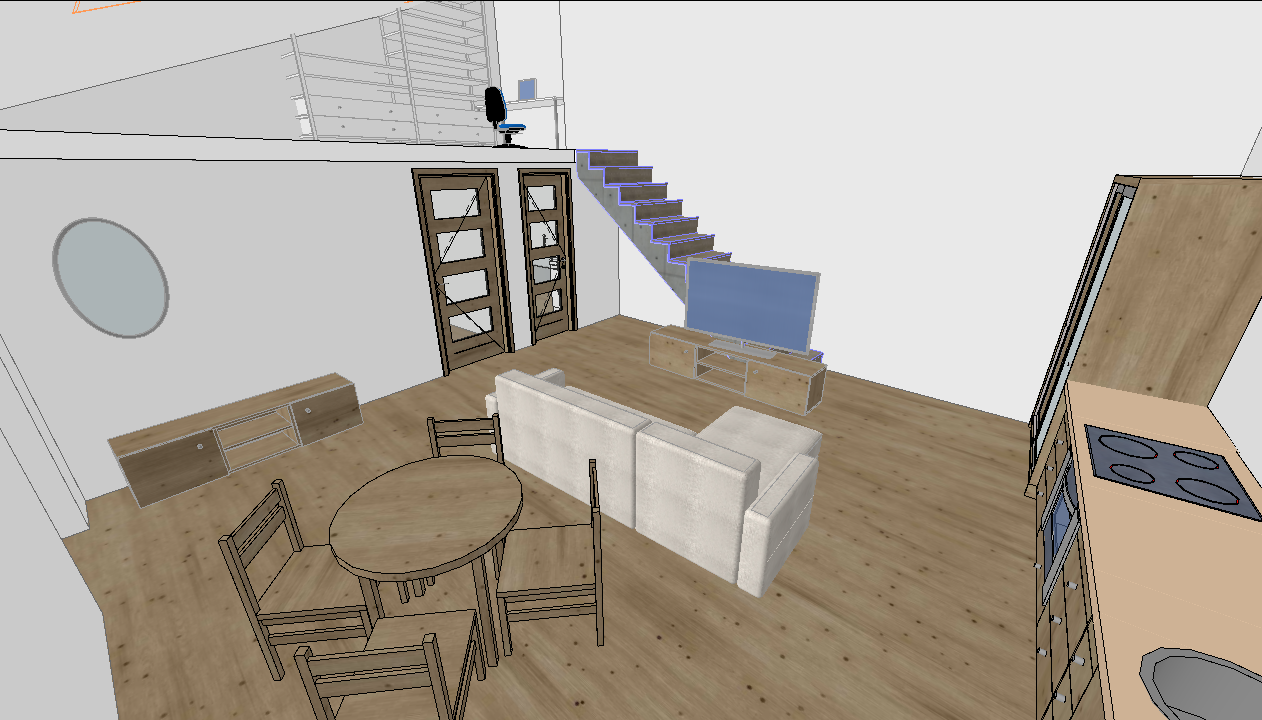 high end modern loft interior open space with exposed white brick walls and dark wooden ceiling beams minimalist black metal staircase with wooden steps leading to a mezzanine bedroom large navy blue sectional sofa on a plush grey rug light oak wood flooring natural daylight coming through large windows industrial style pendant lights photorealistic 8k resolution architectural photography