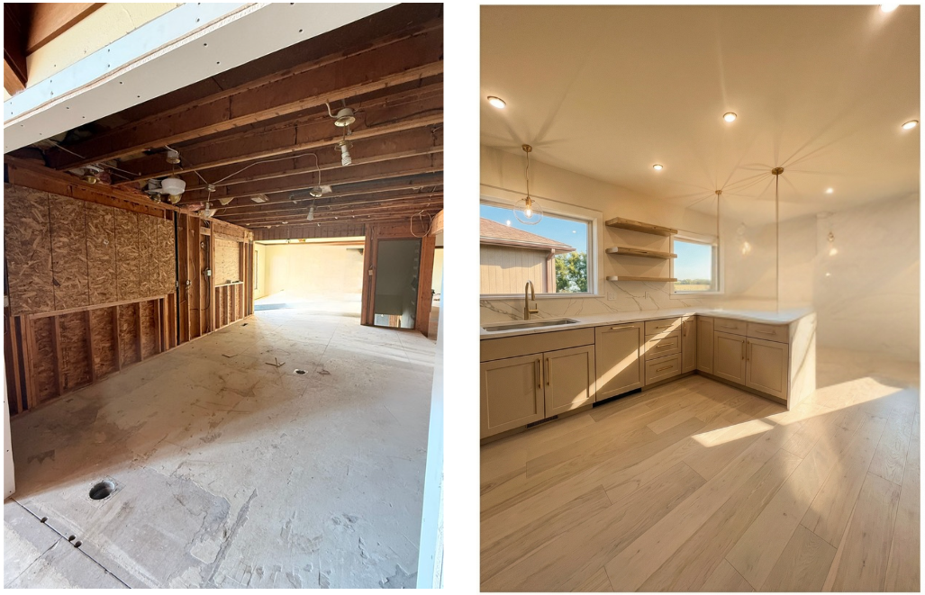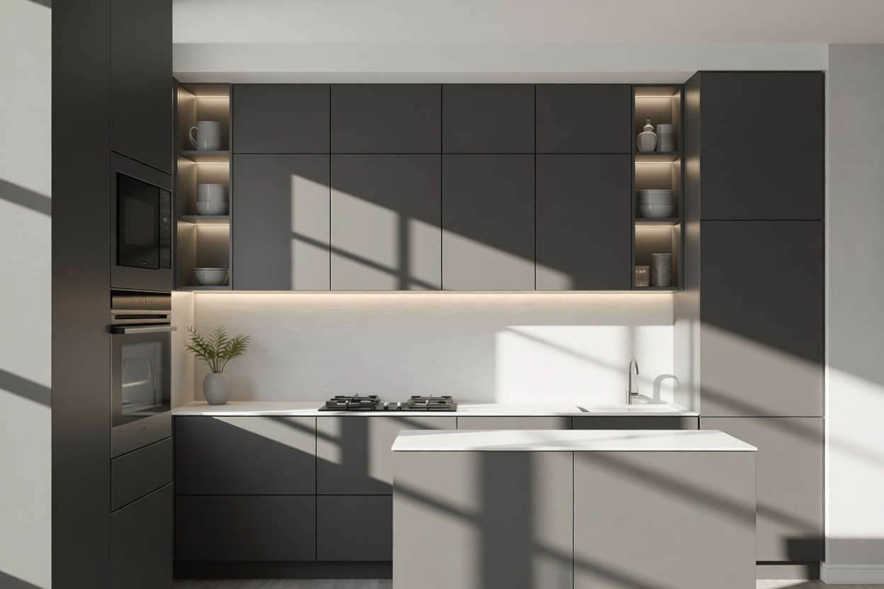 use the unfinished image as the base and strictly preserve its exact camera angle perspective depth and layout do not alter wall position ceiling height or the opening in the background apply the kitchen design only along the right wall of the base image aligning cabinetry to that wall and following its exact perspective lines keep the open walkway and background area unchanged use the reference image only for materials and style light wood cabinetry white countertops warm lighting and modern fixtures do not change viewpoint zoom or composition image to image transformation only