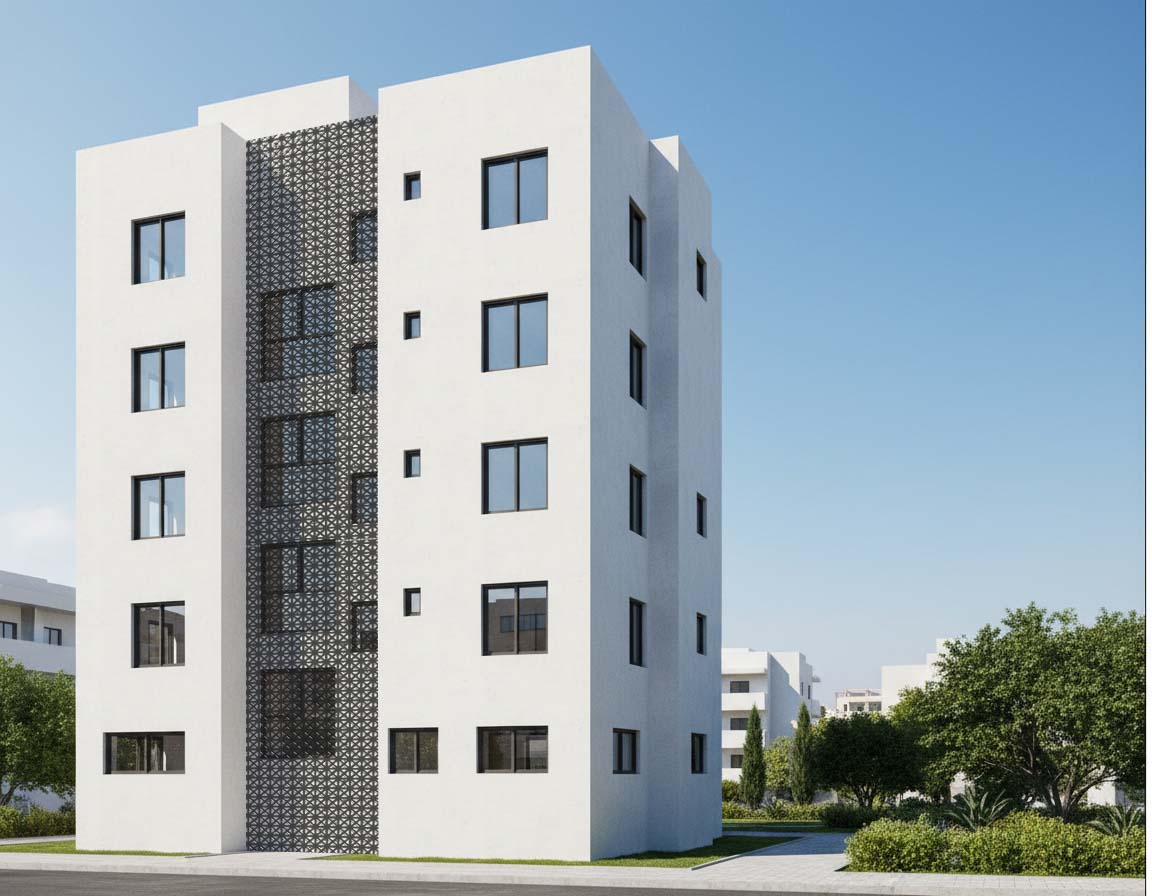 enhance only the existing perforated facade panel make the perforated wall clearly read as real metal realistic architectural metal material aluminum steel correct metallic reflections and highlights visible specular response to sunlight subtle reflections of sky and surroundings on the metal surface realistic roughness not flat not glossy clear depth and thickness of the perforated screen light passing through the perforations windows visible behind do not change building geometry facade layout window positions camera angle or framing colors of other materials focus exclusively on improving the realism of the perforated metal panel use a photorealistic architectural visualization style