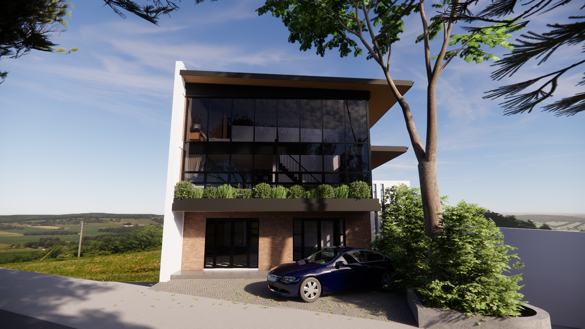 add realistic vegetations and house structures around the building cars and people can be seen within the streets