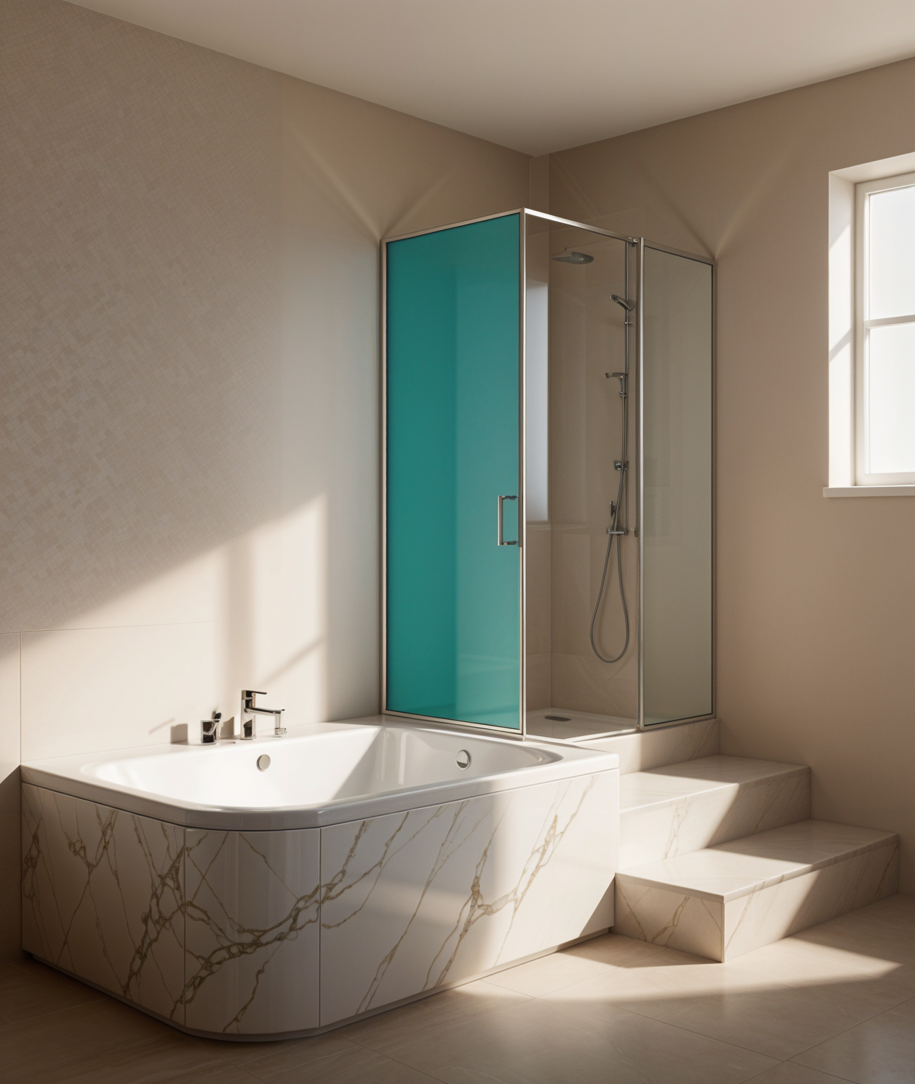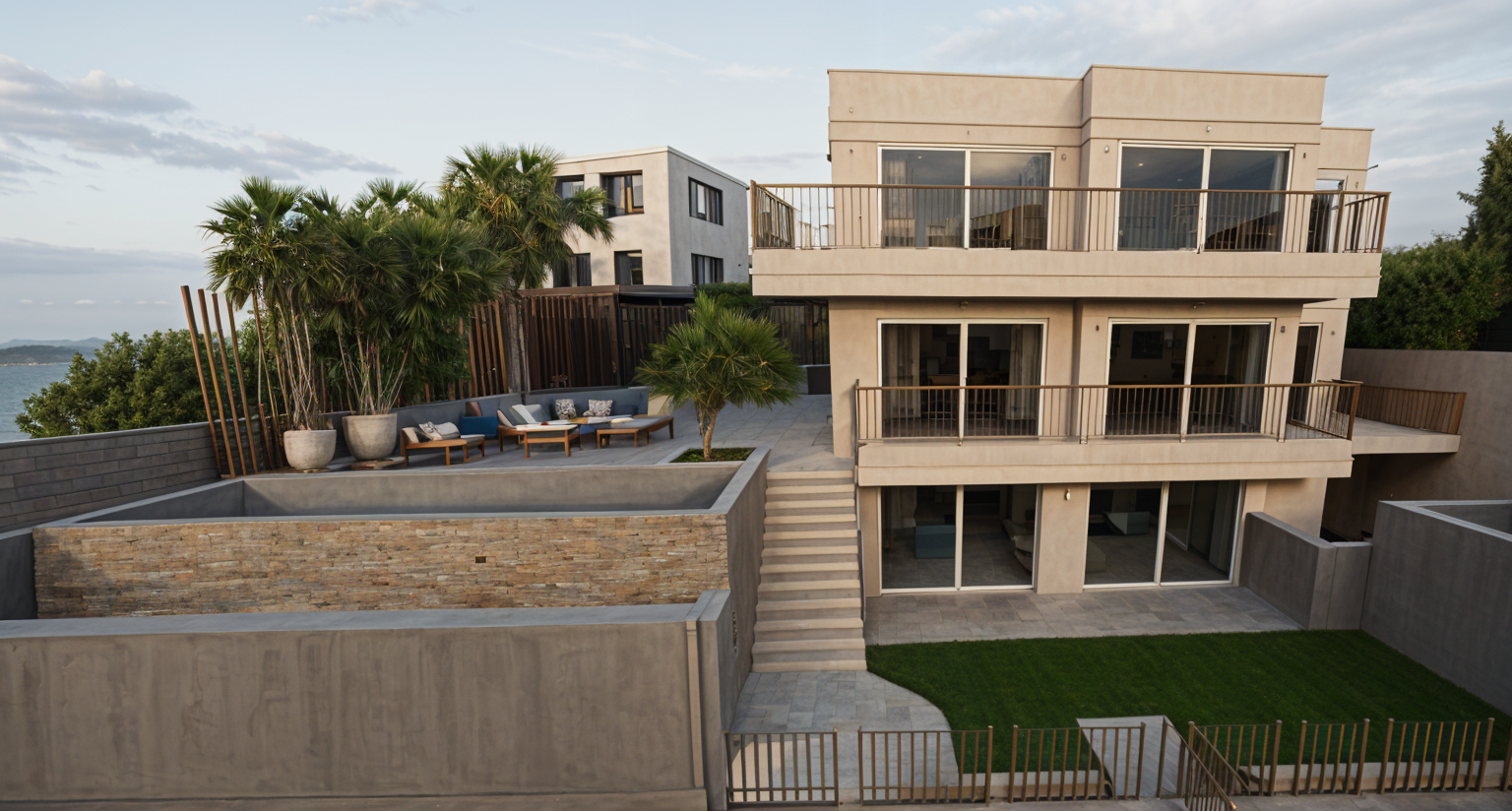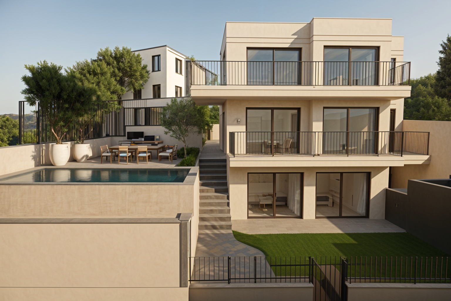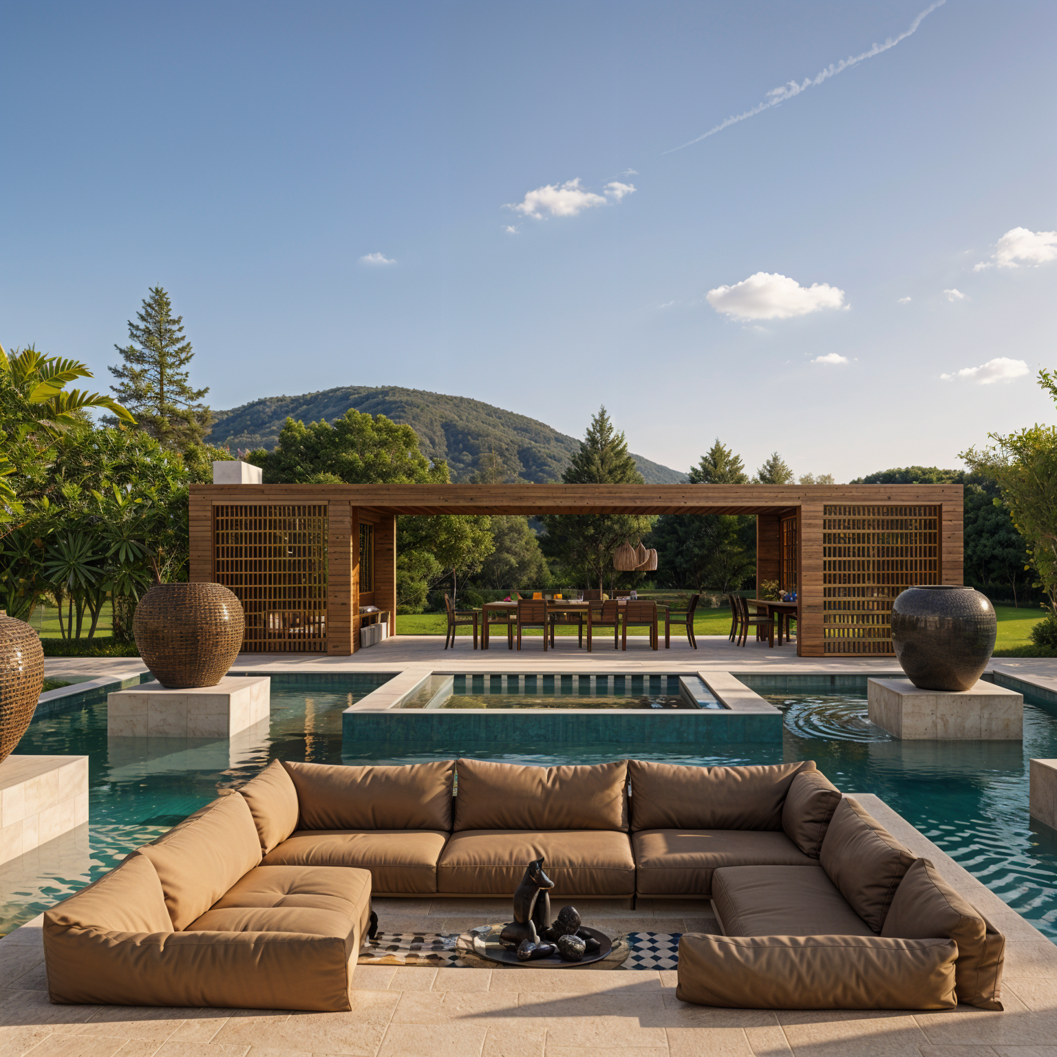 create an exquisite scene of a luxurious outdoor patio with a serene pool surrounded by lush greenery design a cozy seating area with a tan l shaped sofa encircling a small fire pit incorporate a turquoise pool with geometric tile patterns and a rustic wooden pergola featuring intricate lattice patterns position elegant oversized terracotta planters with lush palms alongside the pool showcase a modern dining area under the pergola with natural wooden tables and black chairs capture the ambiance in a bright sunny atmosphere with a clear blue sky dotted with fluffy white clouds set against a backdrop of rolling green hills and a majestic mountain