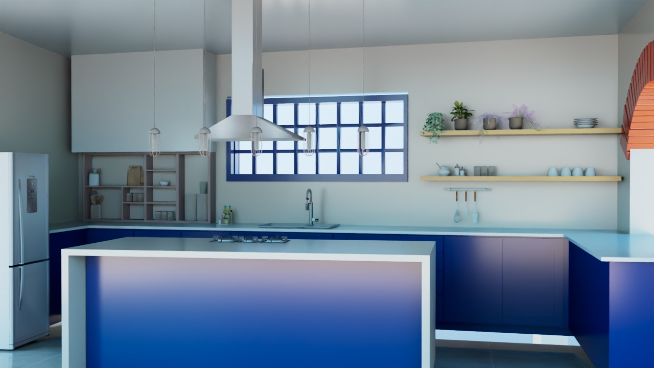 minimalism interior shot interior shot of a kitchen with dark blue pantries and white countertops wood shelves golden hour blue mosaics on the window wall architecture