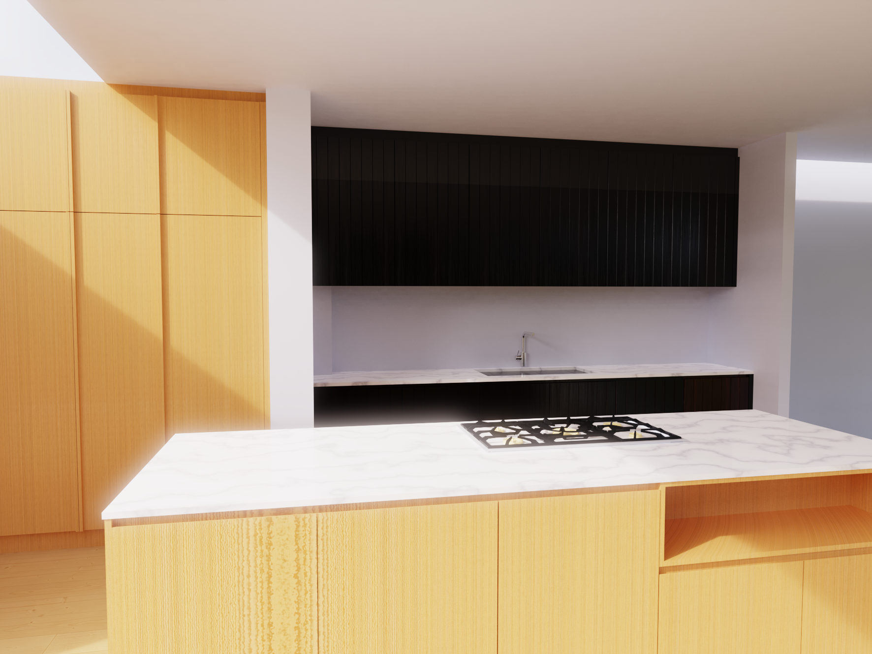 a light white oak kitchen with dark stained timber doors marble counters and full height splashback add some books into the island shelf and some simple modern kitchen ceramics and glassware