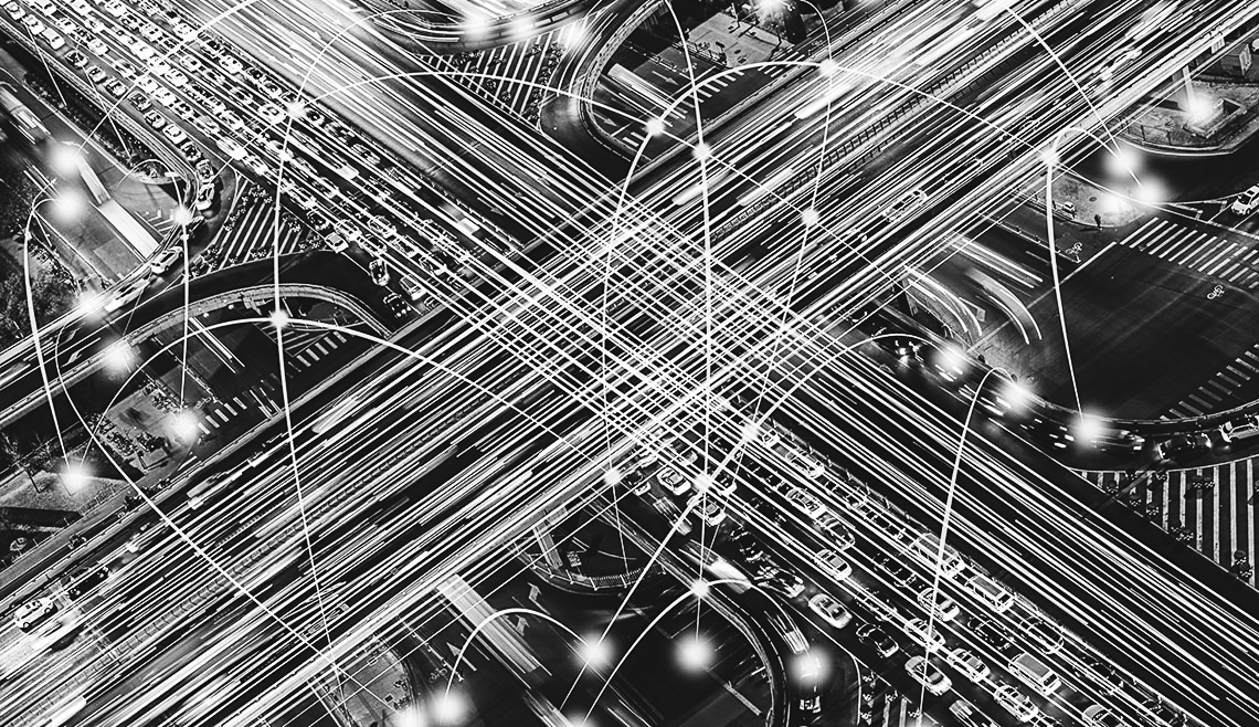 analytical urban network visualization monochrome aerial base subtle cyan flow lines and node highlights precise thin geometry data driven aesthetic no heavy glow high clarity structured analytical mood architectural research visualization style