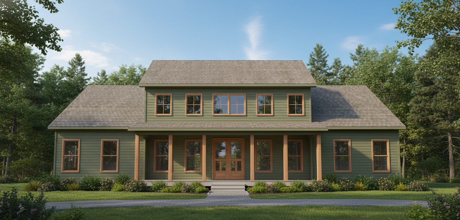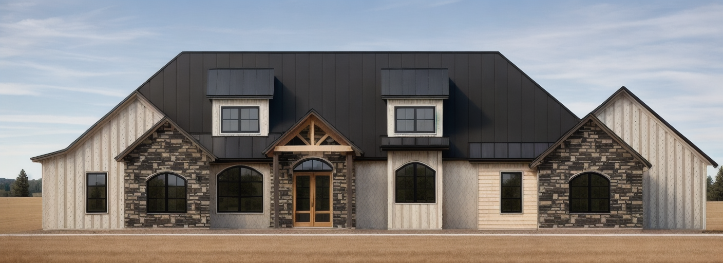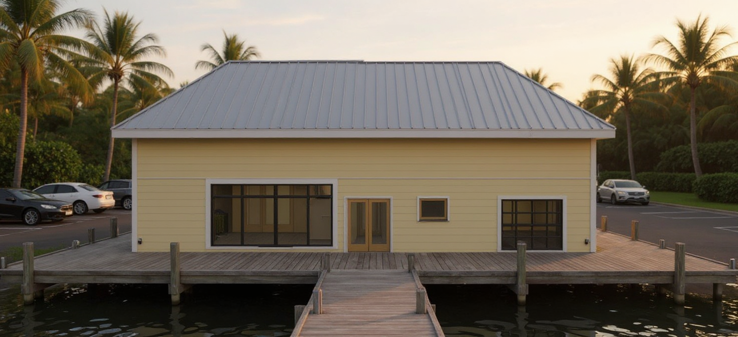 looking directly at the building from the perspective of standing on a dock looking directly at the building behind the building is a parking lot with tropical foliage beyond the parking lot the building is very pale yellow with white trim the trim around all the windows are also white the roof is light color metal the sun is setting in the distance the roof has an 8 foot overhang across the front only