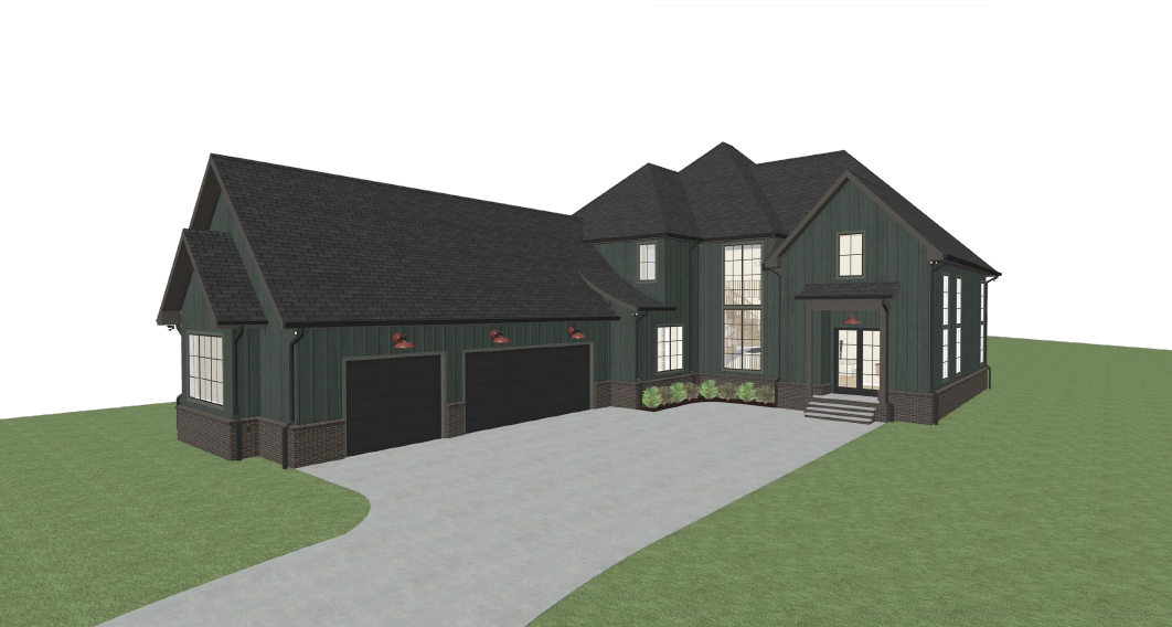 render this modern transitional luxury home change the exterior color of the vertical board and batten to a creamy white add light shrubs and flowers around the sides but not the driveway keep the windows and gutters and trim black add realism change the front doors to be walnut color wood with half glass change the entry pillars to the same wood add a few trees to the lot behind the house