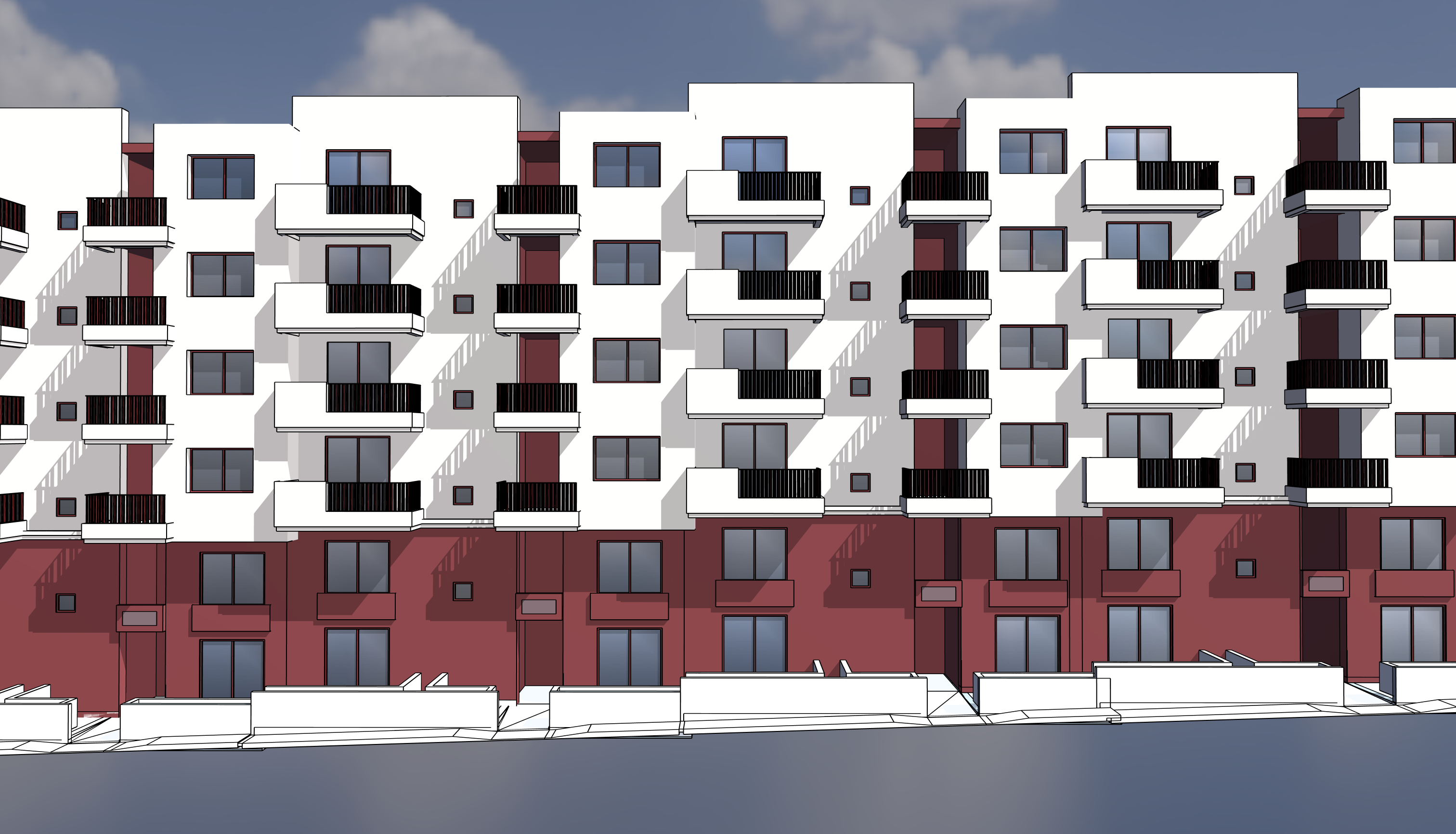 a high resolution photorealistic architectural render of a six storey social housing building conceived as a calm contemporary urban block with a strong civic presence the composition is rational restrained and materially expressive suitable for long term public housing the lower two floors are articulated as a continuous light terracotta plinth finished in honed terracotta with a subtle vertical texture giving the building a grounded tactile base and reinforcing human scale at street level the terracotta reads as warm durable and carefully detailed planting is introduced at the base of the building softening the plinth and reinforcing the relationship to the public realm above the upper four floors are rendered in smooth white plaster light and understated allowing the building mass to feel calm and refined while clearly contrasting with the terracotta base a horizontal band separates the terracotta plinth from the upper floors creating a deliberate shadow gap that clearly articulates the base and adds depth to the fa ade window and door openings are consistently framed in terracotta coloured surrounds reinforcing material continuity across the fa ade balconies are expressed with a recessed edge detail creating shadow lines that add depth and rhythm to the elevation balcony railings are slim metal elements finished in matching terracotta tones precise and minimal contributing to a cohesive architectural language rather than decorative effect vegetation is integrated across the fa ade in a loose non uniform manner with plants placed along selected balconies and fa ade points adding softness depth and a lived in quality without appearing overly designed at ground floor level a modest front garden with layered greenery shrubs and planting mediates between the public realm and private dwellings reinforcing social value and environmental comfort people are shown interacting naturally at ground level and on balconies conveying everyday use community and human scale without dominating the architecture soft neutral daylight with realistic shadows emphasizes material texture recessed balcony details and the shadow gap between base and upper floors the render avoids exaggeration and visual noise presenting the project as credible contemporary and publication ready aligned with progressive models of government led social housing the terrraccotta needs to be more reddish than orange