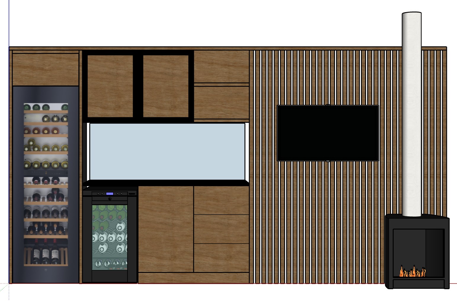 modern oak bar with two glass cabinets and indirect shelf lighting with lux feel