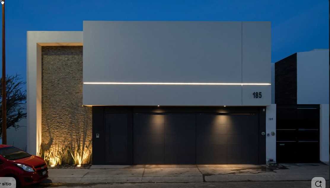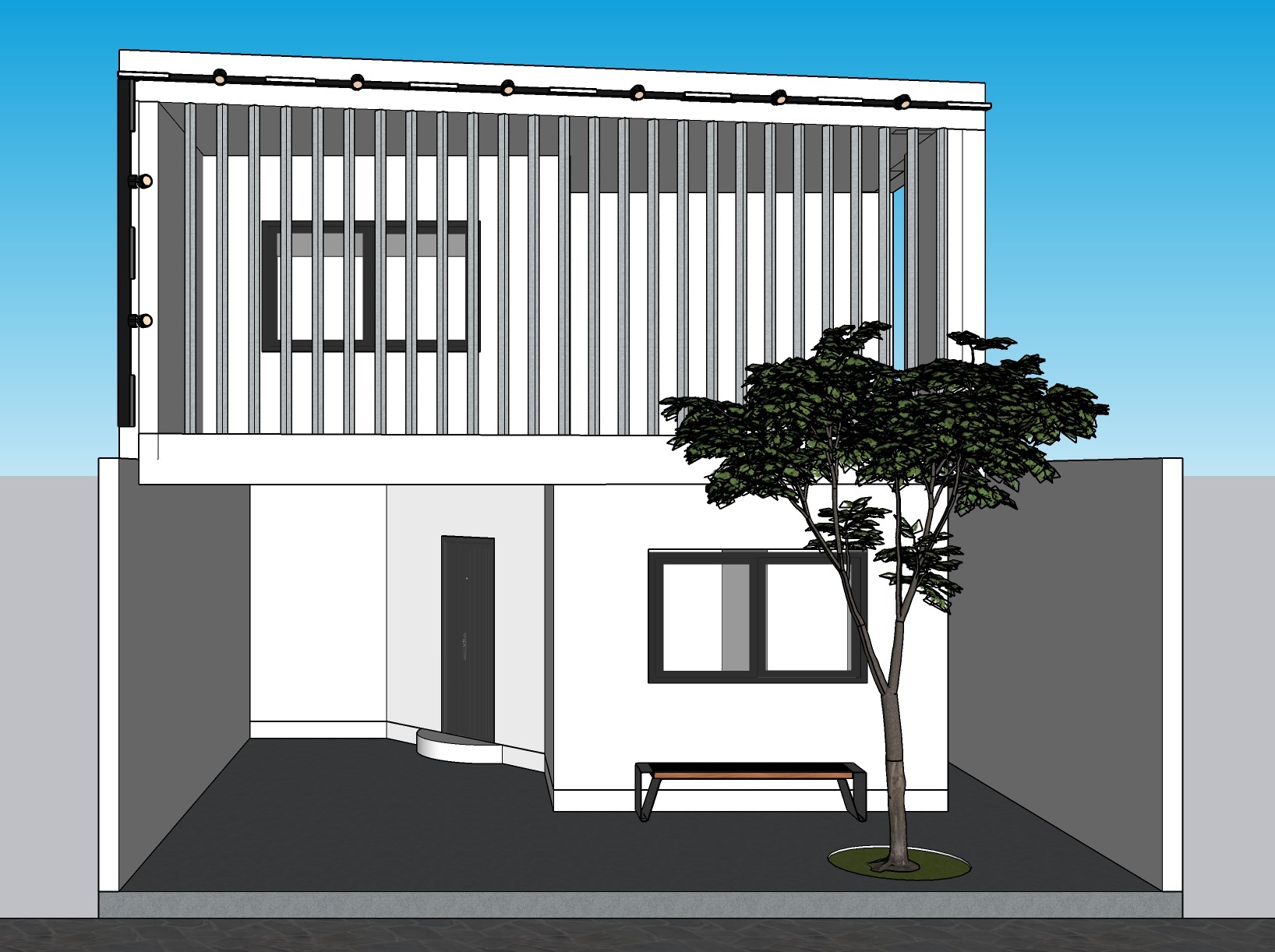 exterior shot a modern two story facade with vertical slats pristine white exterior walls and sleek dark accents the lower section includes a black door and large window a solitary tree with lush green foliage adds a natural touch accompanied by a minimalist wooden bench the atmosphere exudes contemporary elegance with the sky transitioning from a bright blue near the horizon to a soft gradient towards the top