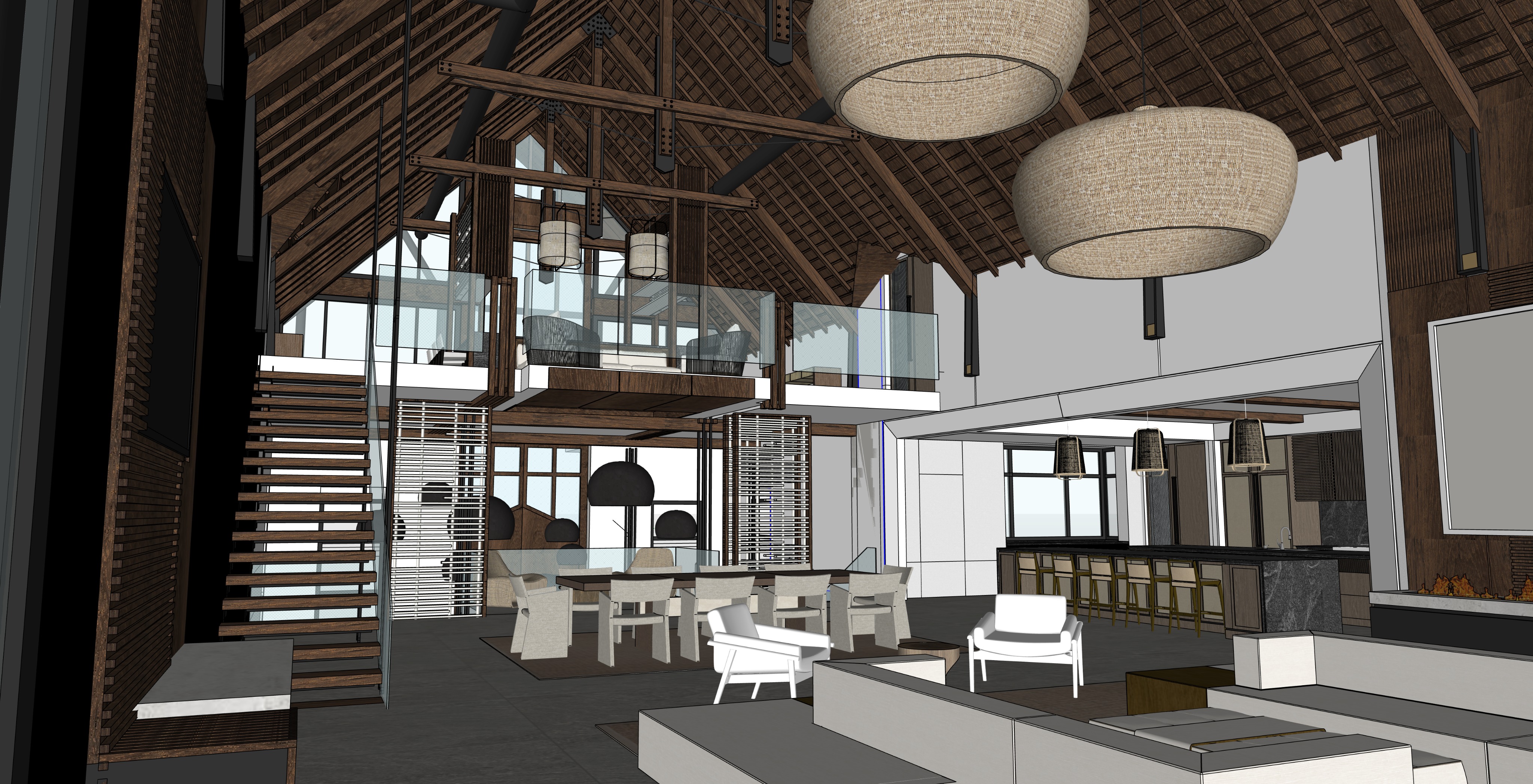 provide bright ambient light as if the space is viewed in the daytime add three people upstairs on the mezzanine put a centerpiece on the dining table have the light fixtures on subtle uplighting on each truss