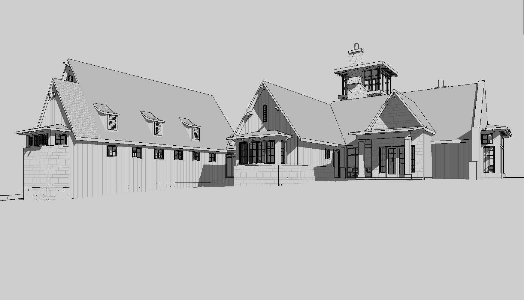 modern farmhouse rustic stone gables vertical wood siding stone tower tall grass foreground fog interior lighting trees in background