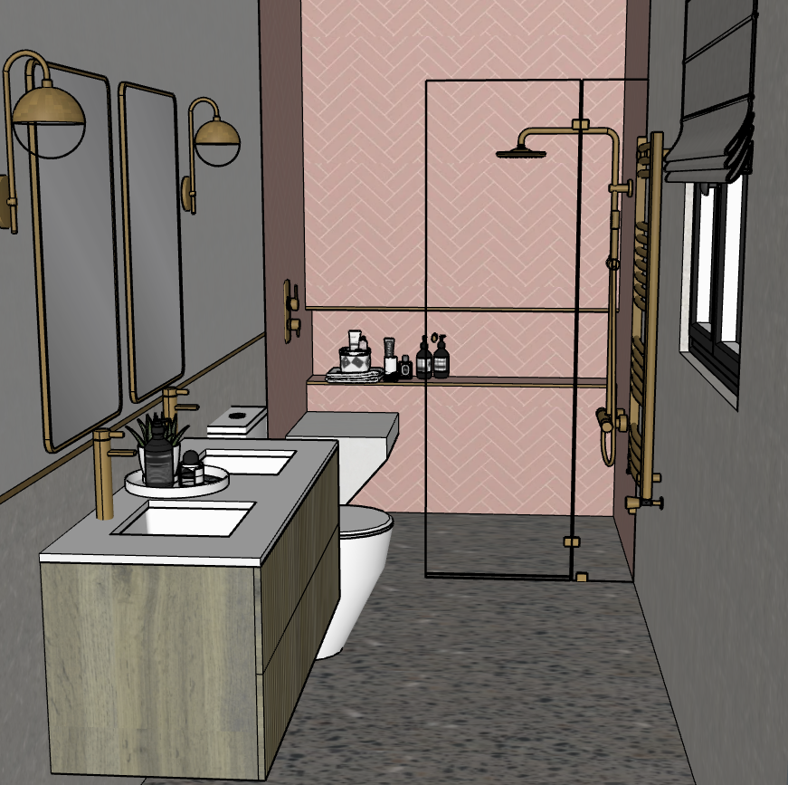 led light in niche in shower and led lights behind the mirrors above vanity with the wall lights on and a single flush spot light in the ceiling above the shower