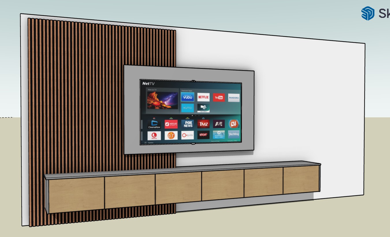 th is a drawing of a tv unit there are led light behind the acoustic panels and surround the tv