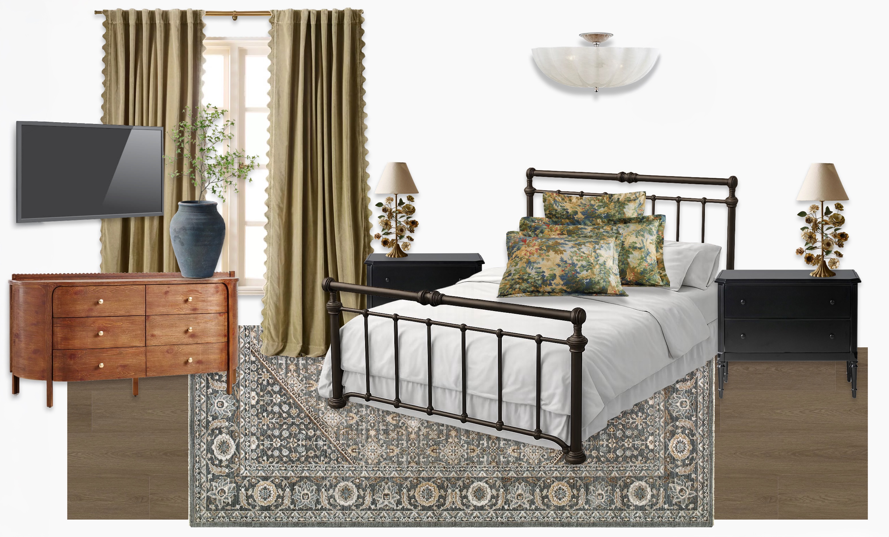 the rug is centered under the bed and nightstands with the ceiling chandelier centered over the bed the window with curtains is on a separate wall to the left to the left of the window we have a wall mounted tv and wood dresser the walls are a creamy beige with picture frame moulding