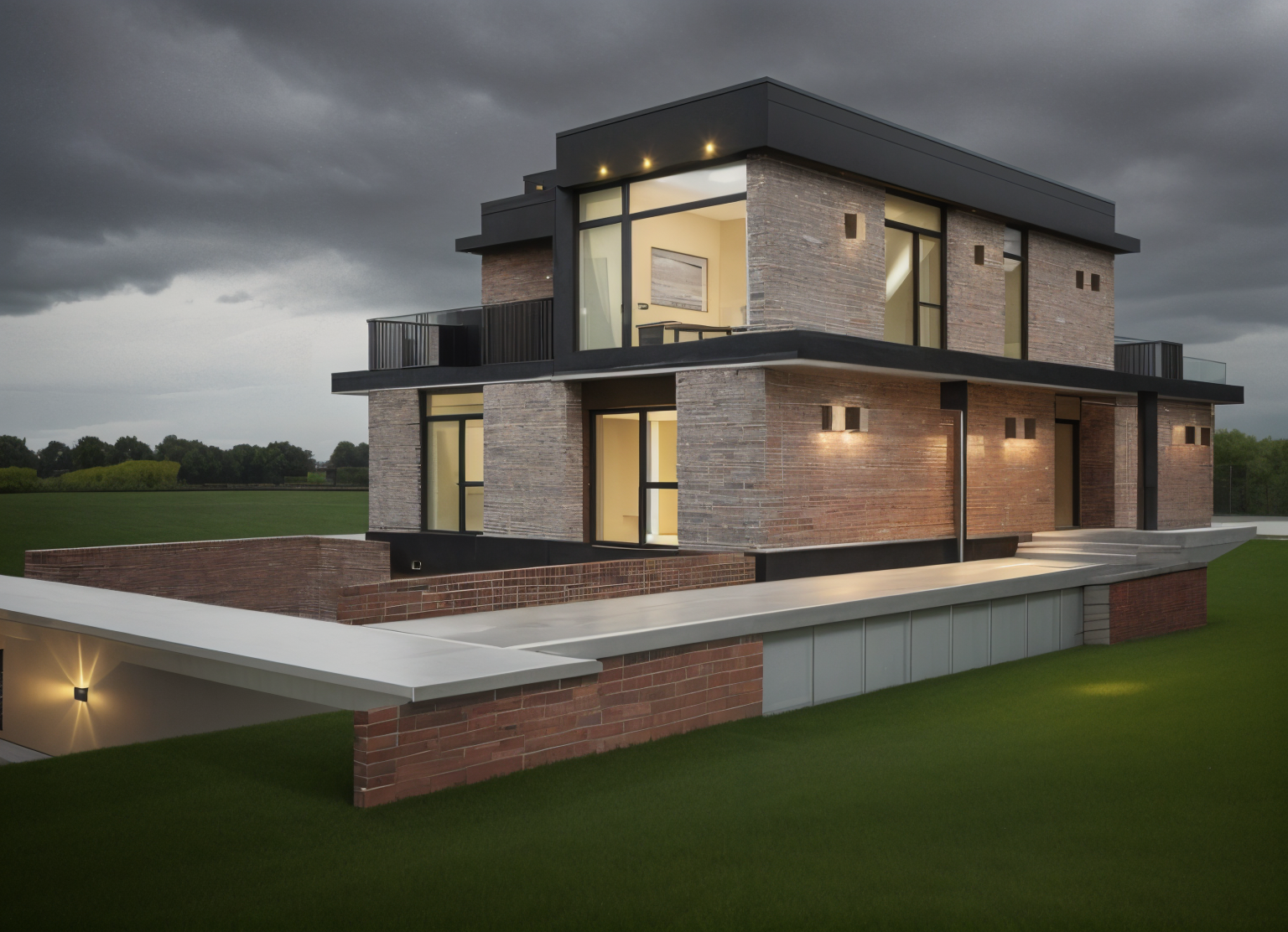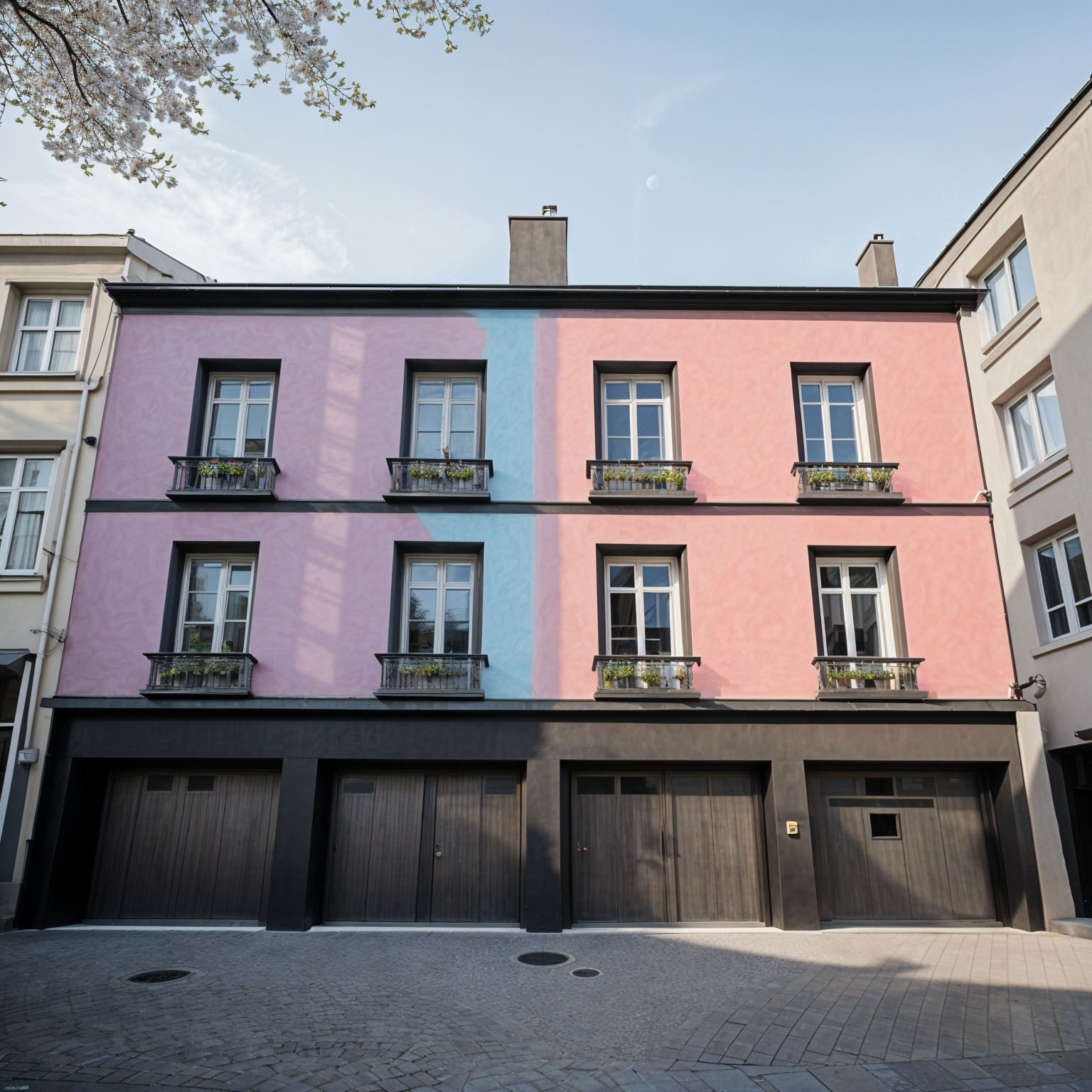 le corbusier exterior shot make a wooden facade with large windows the building is surrounded by greenery by the road add single trees e g pine people children and bicycles by the building grass and tall trees by the building itself architecture
