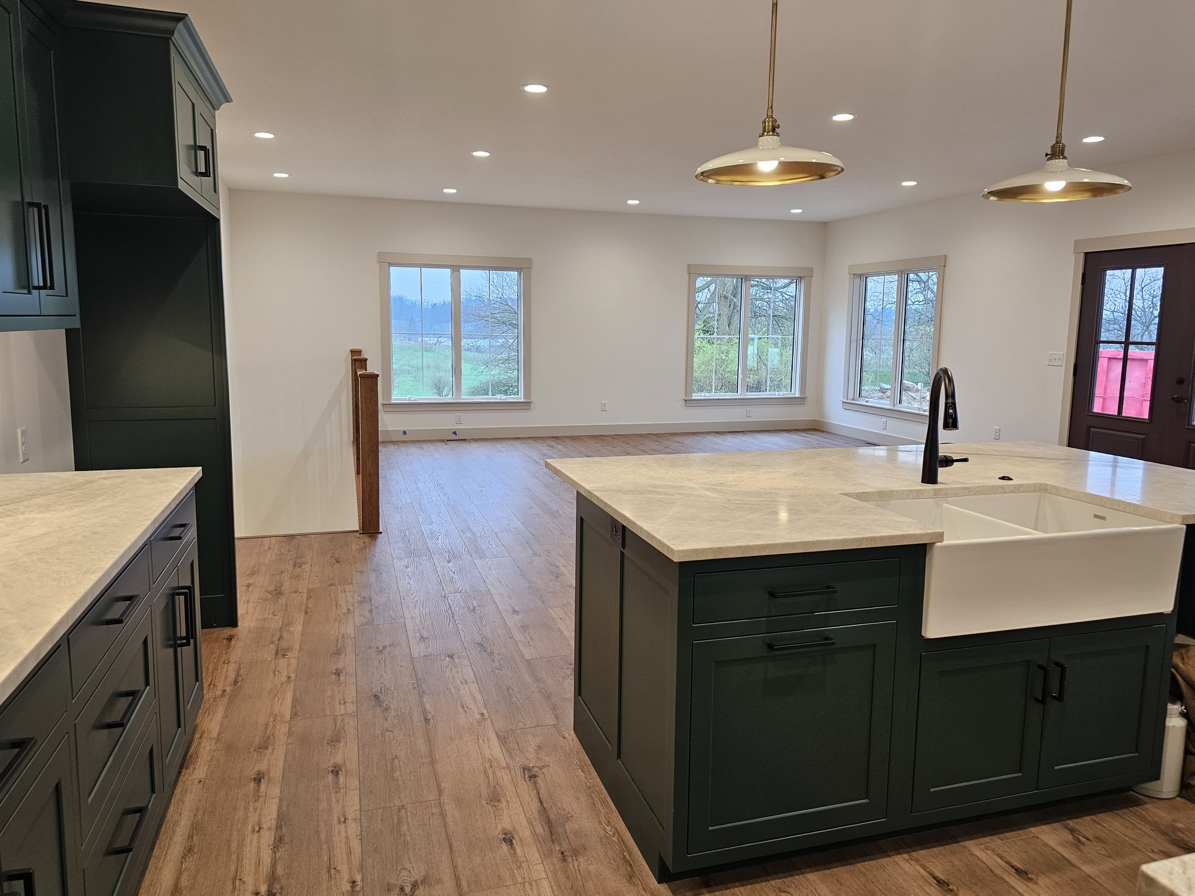 add a fridge in the empty place in the kitchen and add a tv console with flat screen tv on the far wall between the windows add a neutral area rug and sitting area with comfy sofa and 2 arm chairs with some tables and lamps