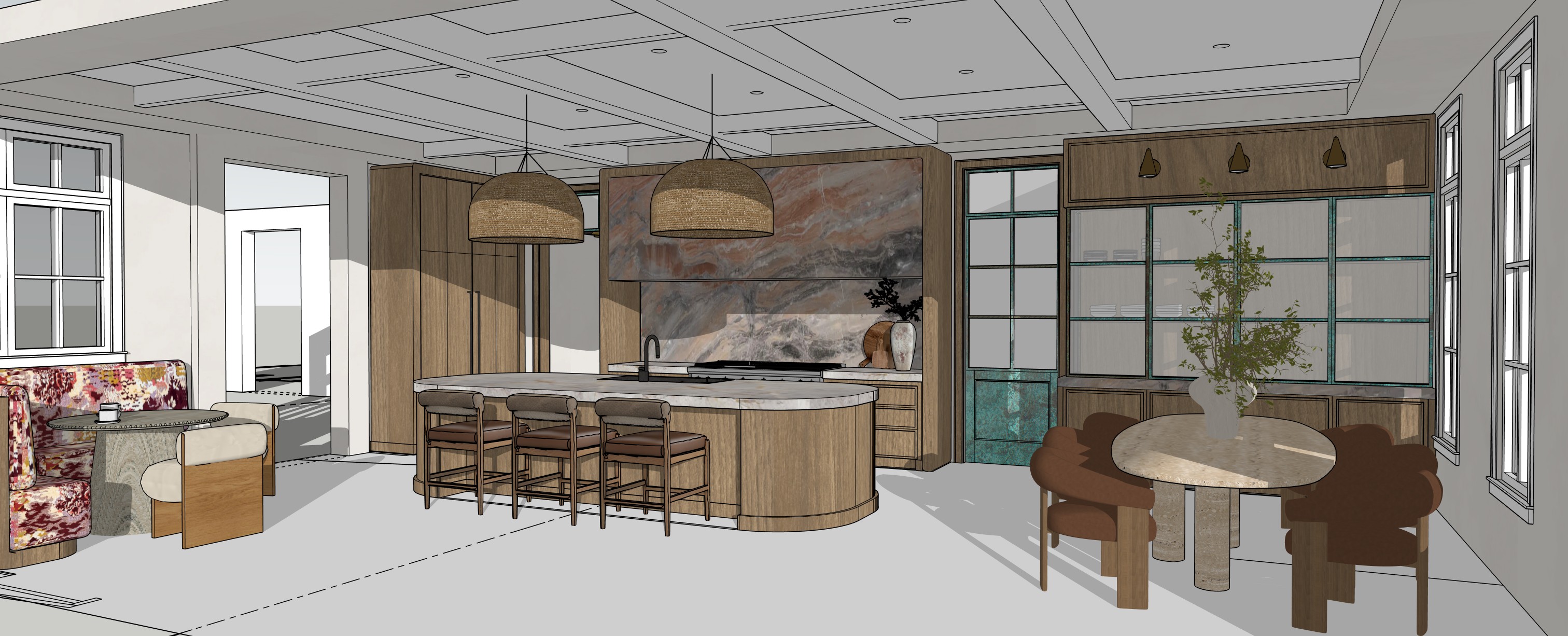 a modern heritage kitchen design darker oak flooring complementing the lighter rift oak wood cabinetry the atmosphere is calm and relaxing accented by lush green branchy plants in architectural vases that act as art the lighting is soft and natural creating a relaxing atmosphere the dining room has copper verdigris metal frames with seeded glass and the shelving inside has linear lighting below the shelves the walls are a plaster finish in city loft by sherwin williams add under counter lighting by the counterstools at the kitchen island turn on the can lighting and use 2700k temp remove the vase on the kitchen island and remove the copper pocket door on the left side of the kitchen