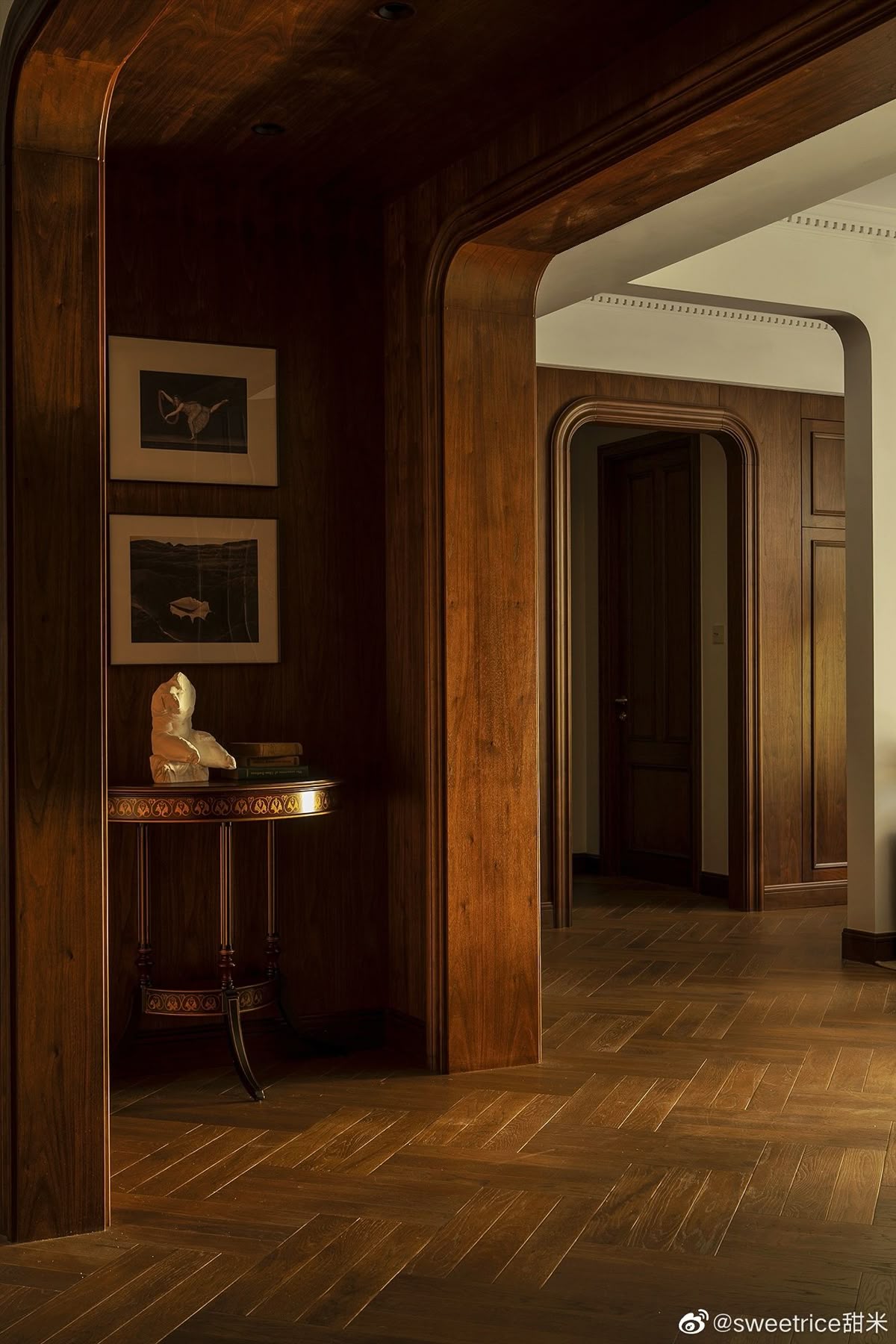 change the wood walls to oxblood plaster finish in the reference image