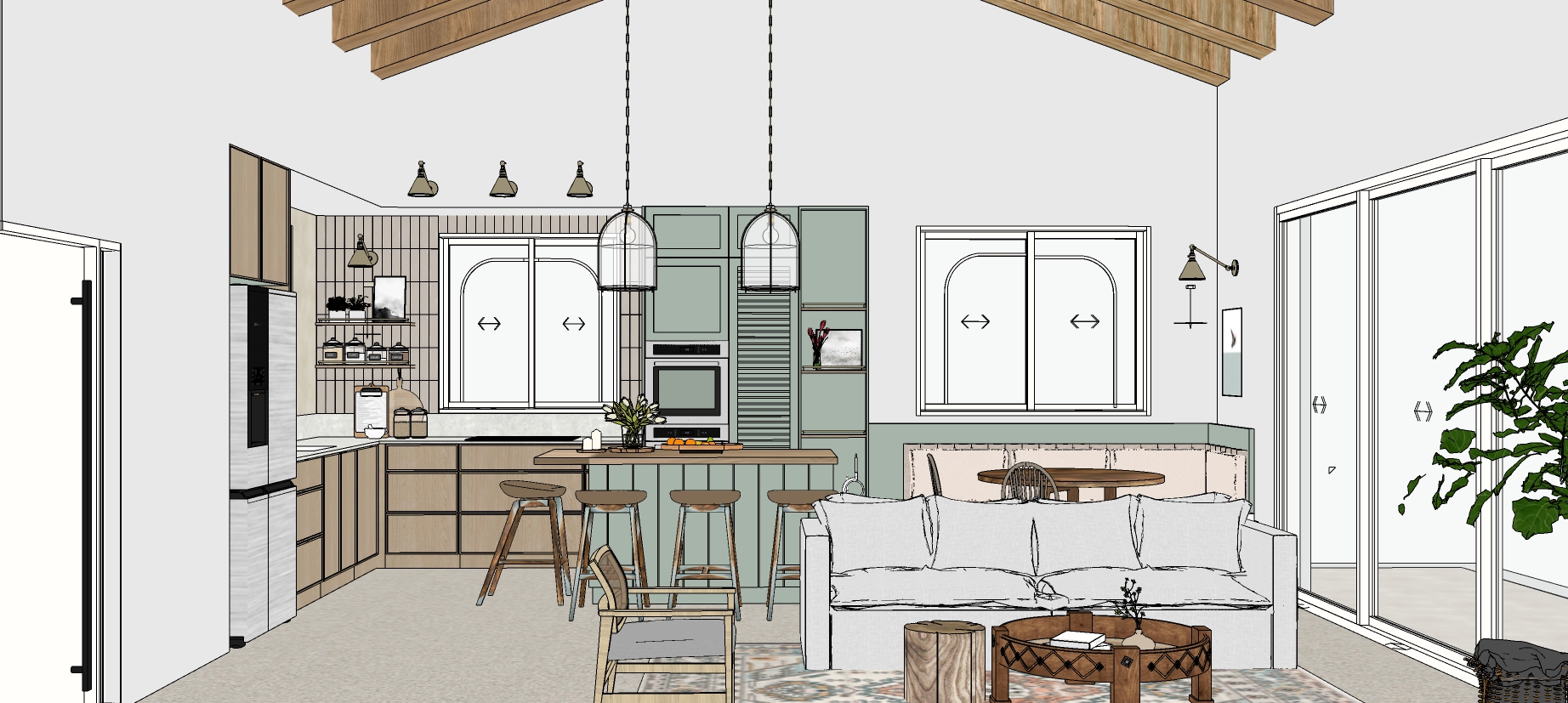 bright light light wood kitchen with basil green cabinets and a corner bench with dinning table