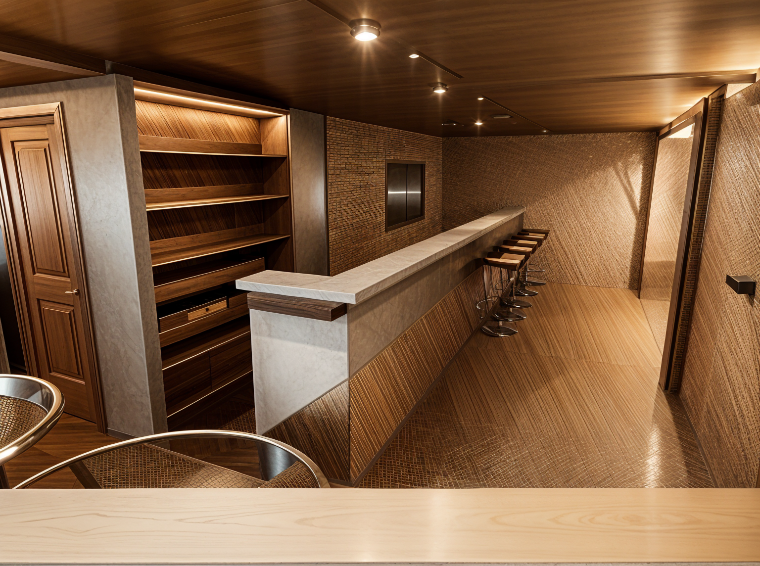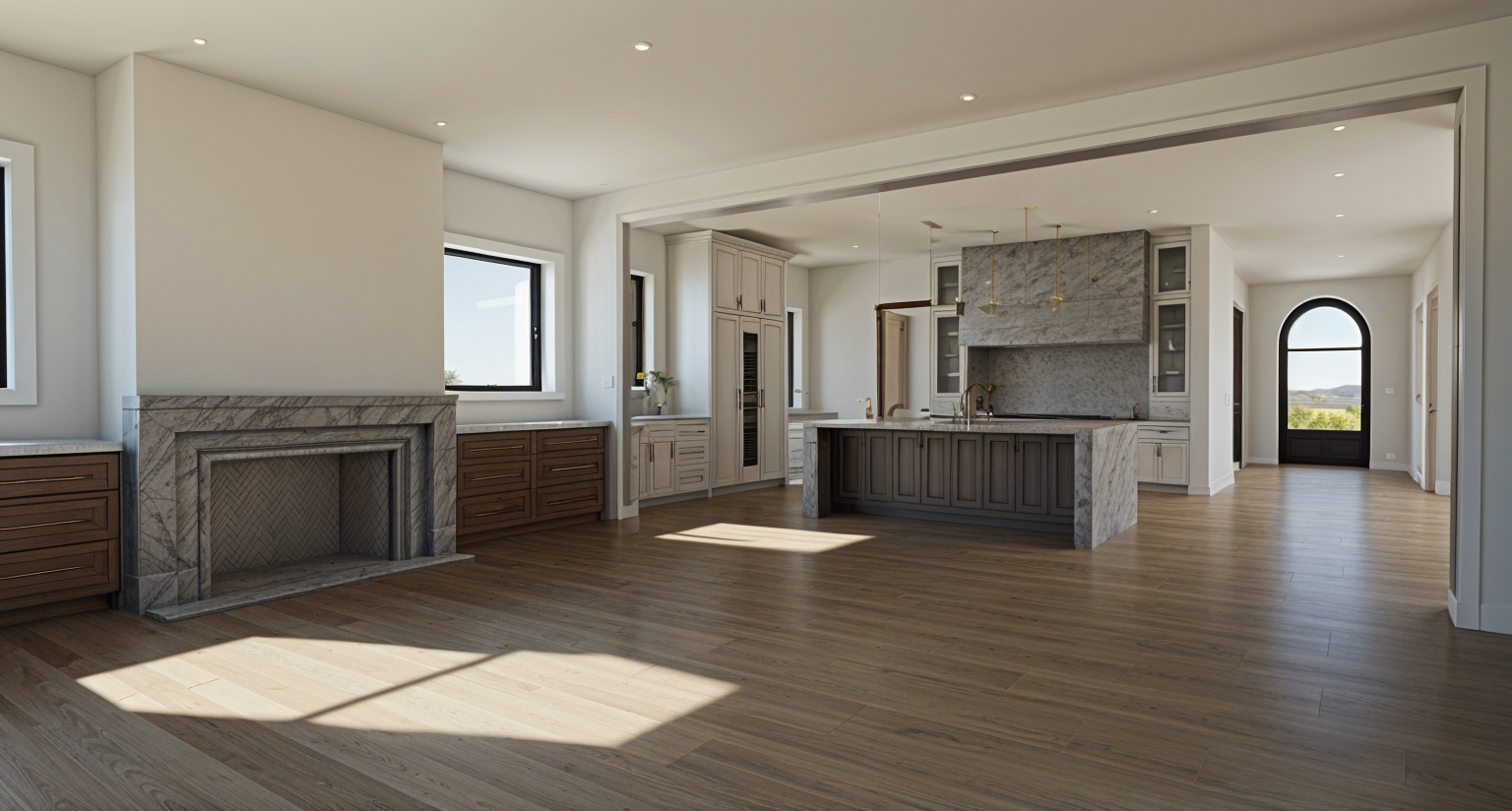 ultra photorealistic cinematic rendering of a kitchen inside a luxury transitional home realistic reflections on marble glass and metal surfaces pbr wood grain texture detail with fine anisotropy leica 35mm full frame aesthetic with shallow depth of field editorial color palette warm whites rich walnut wood and soft daylight neutrals balanced highlights natural contrast and soft reflections for a refined architectural digest style composition