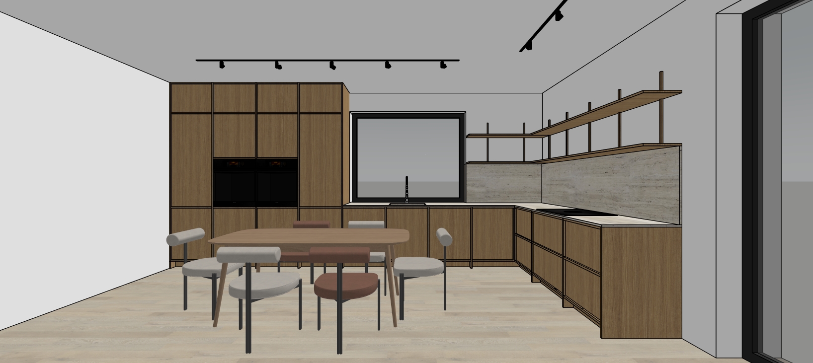 render this kitchen with natural day light add decorations on the shelfs add trees in the windows maintain the exact materials just add the natural light