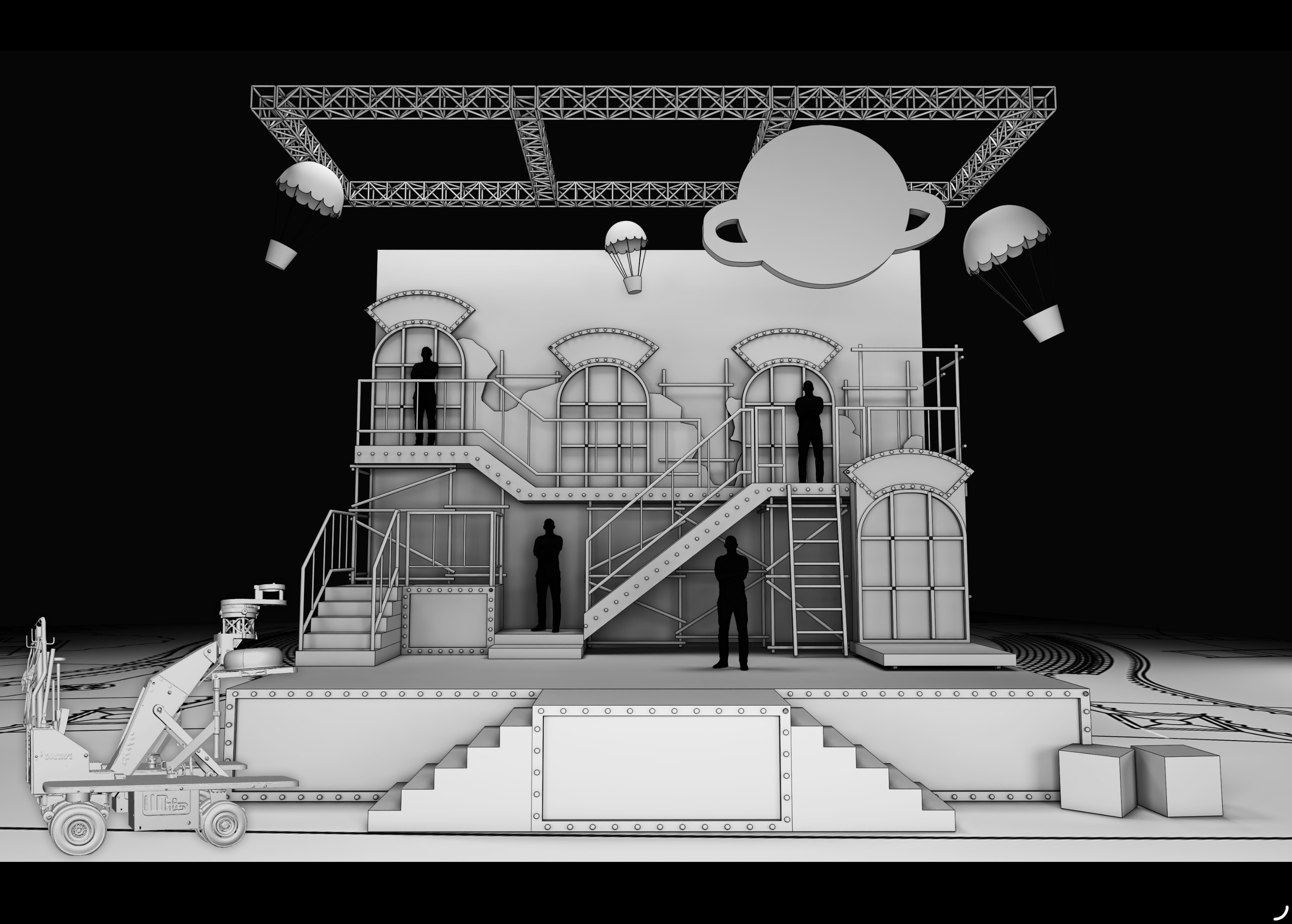 sky cyclorama painting on the wall there is broken brick wall and window frames with a half drawn curtains with red and white stripe in front of the sky painting it should feel old hollywood sound stage interior and old style lightings ropes ladders and props are placed on the stage some of the lightings shoot light beam toward the stage
