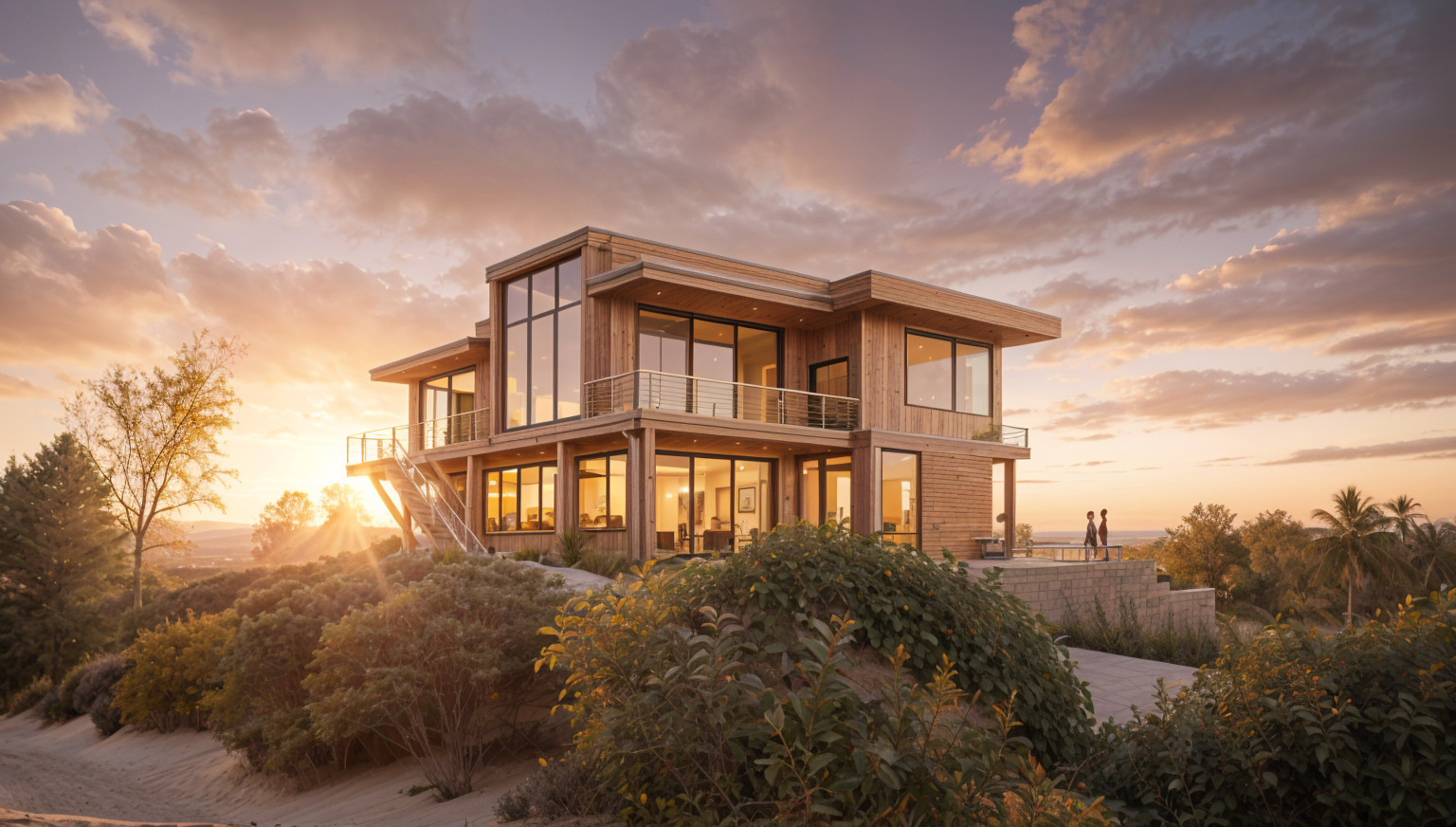 maintain colors stronger sunset outdoor kitchen lush plantings water background add people hazy sky