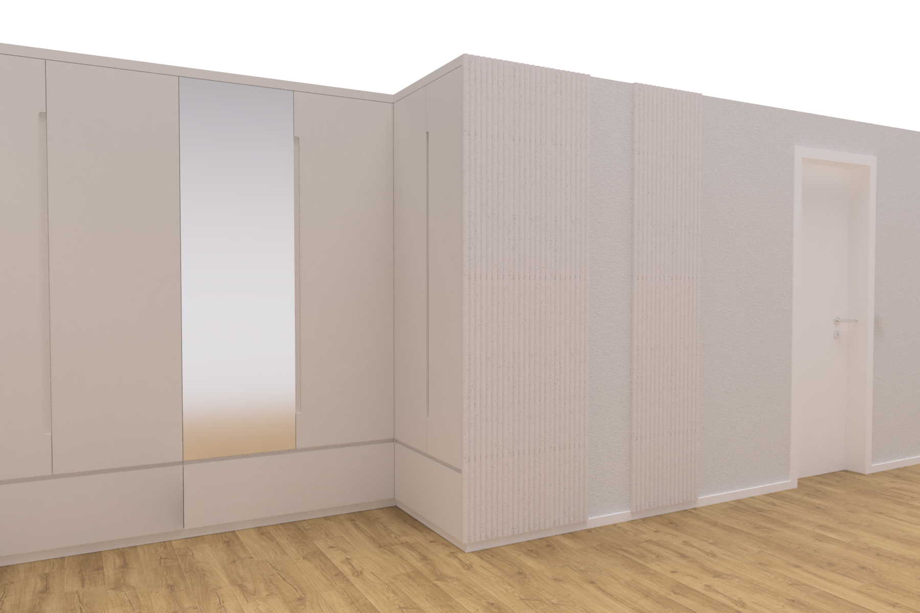 improve the realism of the provided interior render while strictly preserving the original composition and architectural intent strict rules must follow do not change camera framing proportions or geometry do not add remove or redesign any elements do not introduce any new light sources beyond the specified downlights do not add led strips hidden lighting cove lighting or glowing ceilings the result must be based only on the provided image material and color specifications walls light white plaster very subtle texture matte finish floor natural oak wood flooring warm tone realistic grain and subtle imperfections built in wardrobes light white chalk painted finish matte soft texture decorative wall panels concrete panels in the same light white tone as the surrounding plaster walls fine smooth refined texture with subtle micro imperfections vertical rounded fluted ribs soft convex profile consistent spacing baseboards and plinth updated important floor baseboards skirting clean crisp pure white color neutral bright white no grey or beige tint matte finish smooth painted surface with subtle micro imperfections sharp well defined edges wardrobe plinth kickboard exact same color and finish as the baseboards must visually match perfectly no variation in tone or reflectivity matte smooth painted surface clean lines and precise detailing doors light white matte finish door handles brushed stainless steel realistic reflections subtle roughness light switch socket light white lighting very important use only artificial lighting from ceiling downlights recessed spotlights arrange the downlights as a single continuous linear row along the length of the corridor do not create multiple rows or staggered layouts light must clearly originate from these downlights only no led strips no indirect ceiling glow no hidden lighting lighting behavior realistic light cones with soft falloff subtle highlights on panel ribs temperature neutral warm 3000 3500k shadows and realism add realistic shadows especially along the baseboards and wardrobe plinth contact shadows in corners around door frames between vertical ribs of panels include subtle ambient occlusion rendering quality enhance global illumination and indirect bounce light add micro imperfections and realistic material response pbr improve depth and contrast while keeping a natural look keep the scene clean and minimal no stylization or extra elements goal achieve a highly realistic interior render where baseboards and wardrobe plinth form a unified clean white line no color inconsistency between elements materials remain subtle and realistic lighting and shadows define depth naturally
