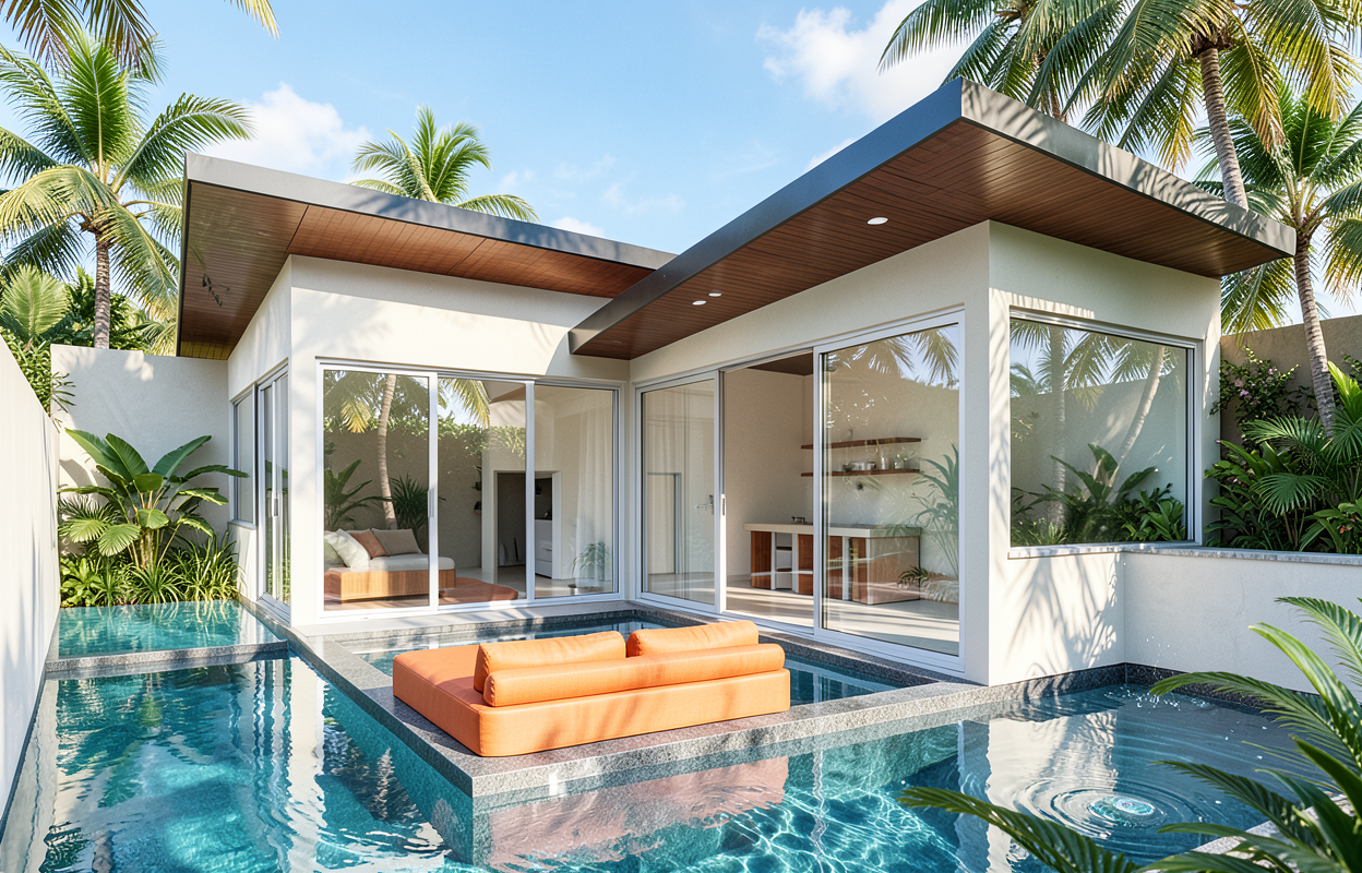 a modern minimalist bedroom design oak flooring complements a curved wall with light wood slat the slats have a minimal color differnce the atmosphere is calm and relaxing the lighting is soft and natural creating a relaxing atmosphere though the window you see a blue sky their are 3 spots in the ceiling in a grid pattern on the bed are two pillows add a white blanket there is no shadows in the cupboard in the hallway add some books on the slatted wood wall