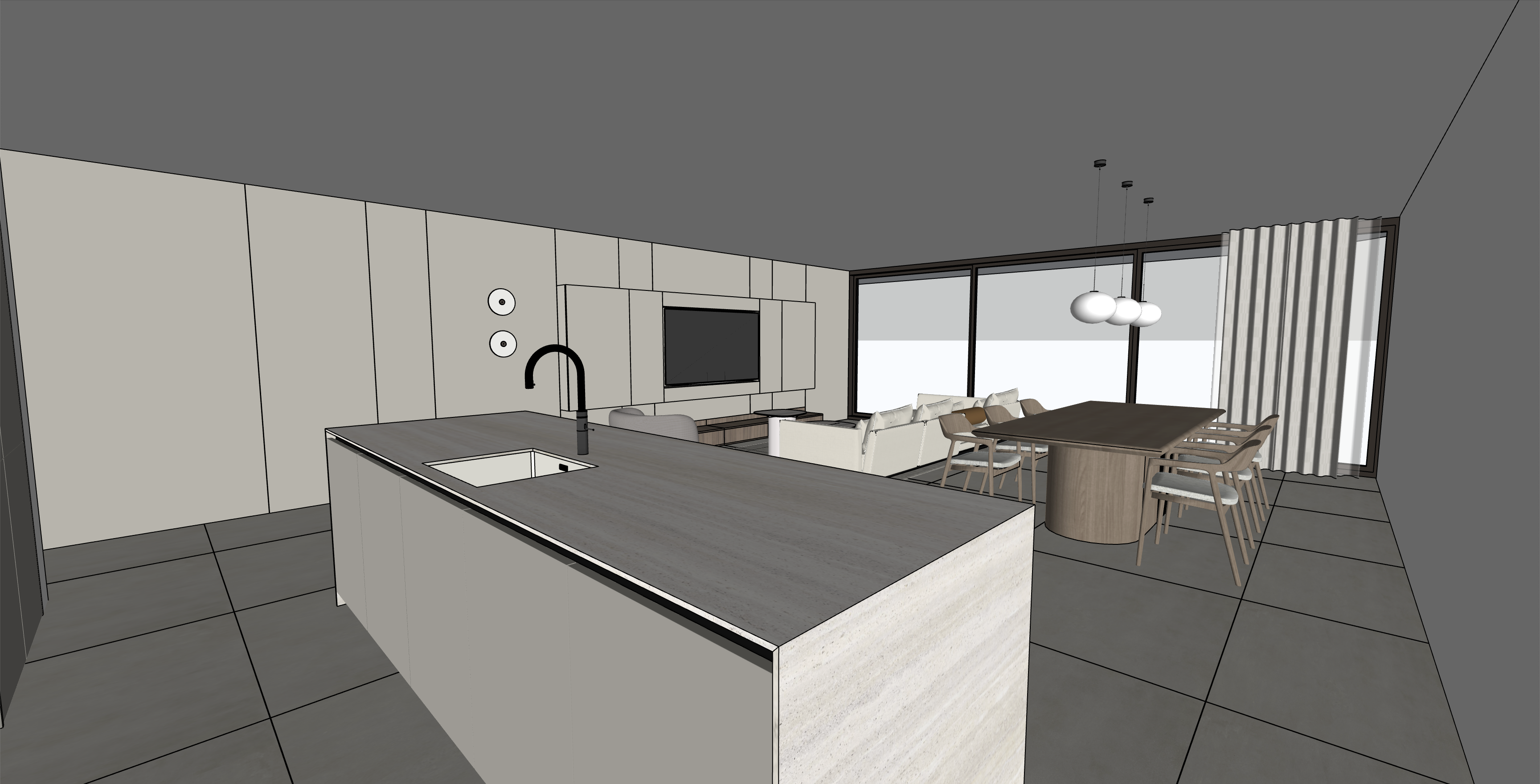 realistic photo from attached file with modern minimalistic design style for interior with large format matt concrete style ceramic tiles seafront pine views from the window and terza stone travertine worktops in the kitchen luxury modern minimal clean sophisticated