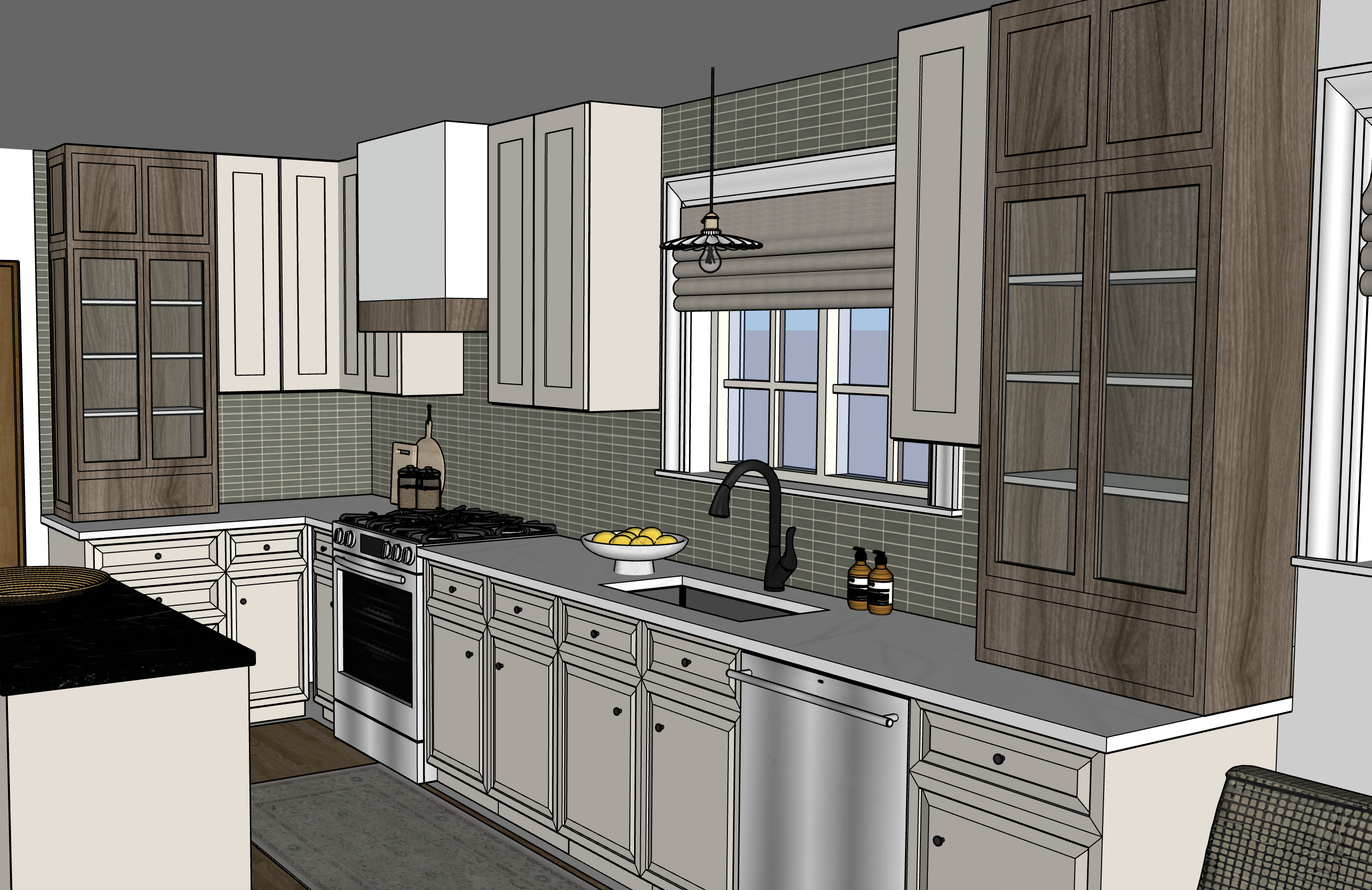 lighten the wood on the wood cabinet to a lighter walnut tone and make the counters white quartz with subtle grey veining keep the island counter black then straighten the perspective of the shot