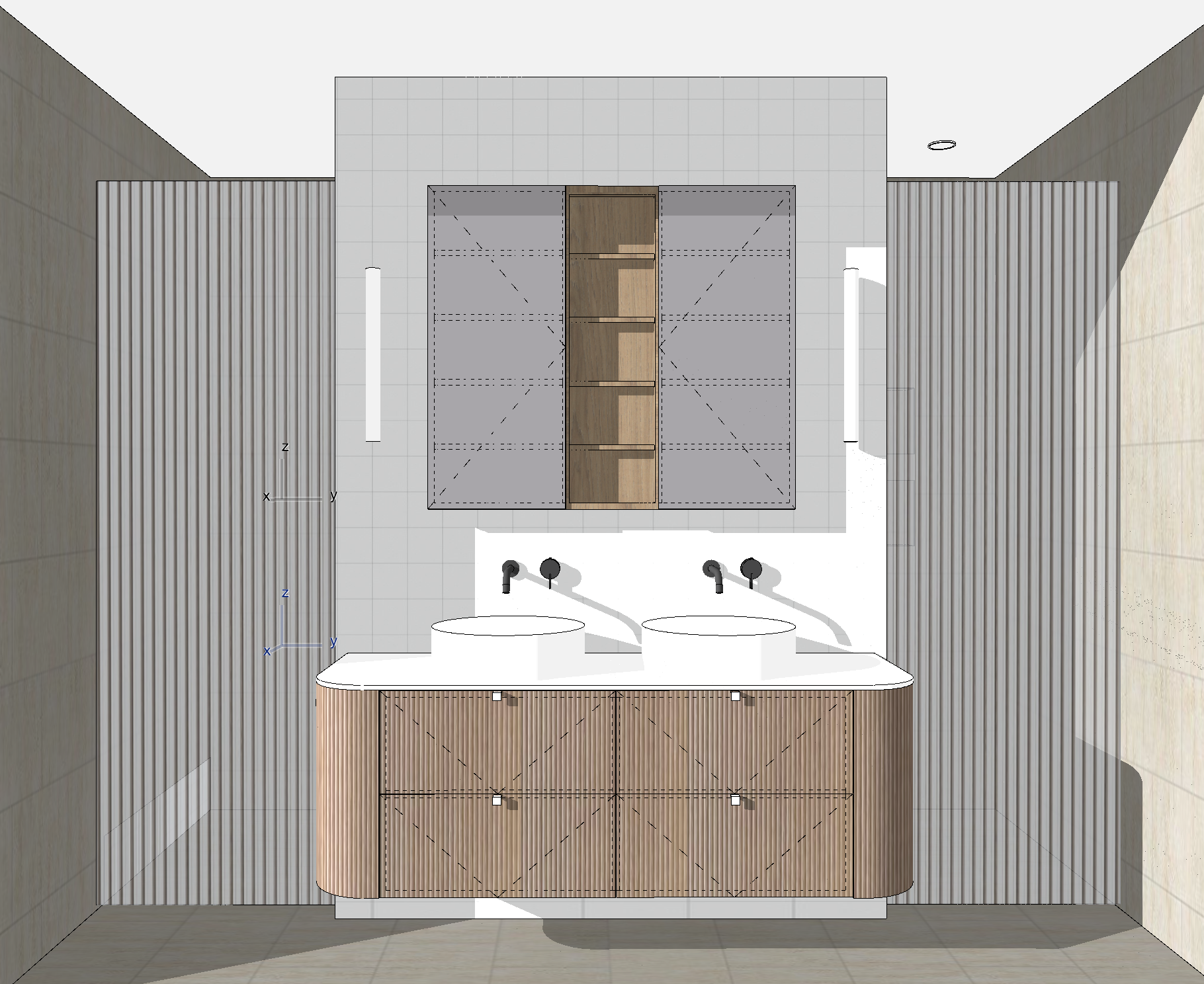 national tiles ascoli cross cut tiles white matt zellife tiles fluted glass shower screens polytec coastal oak gunmetal taps