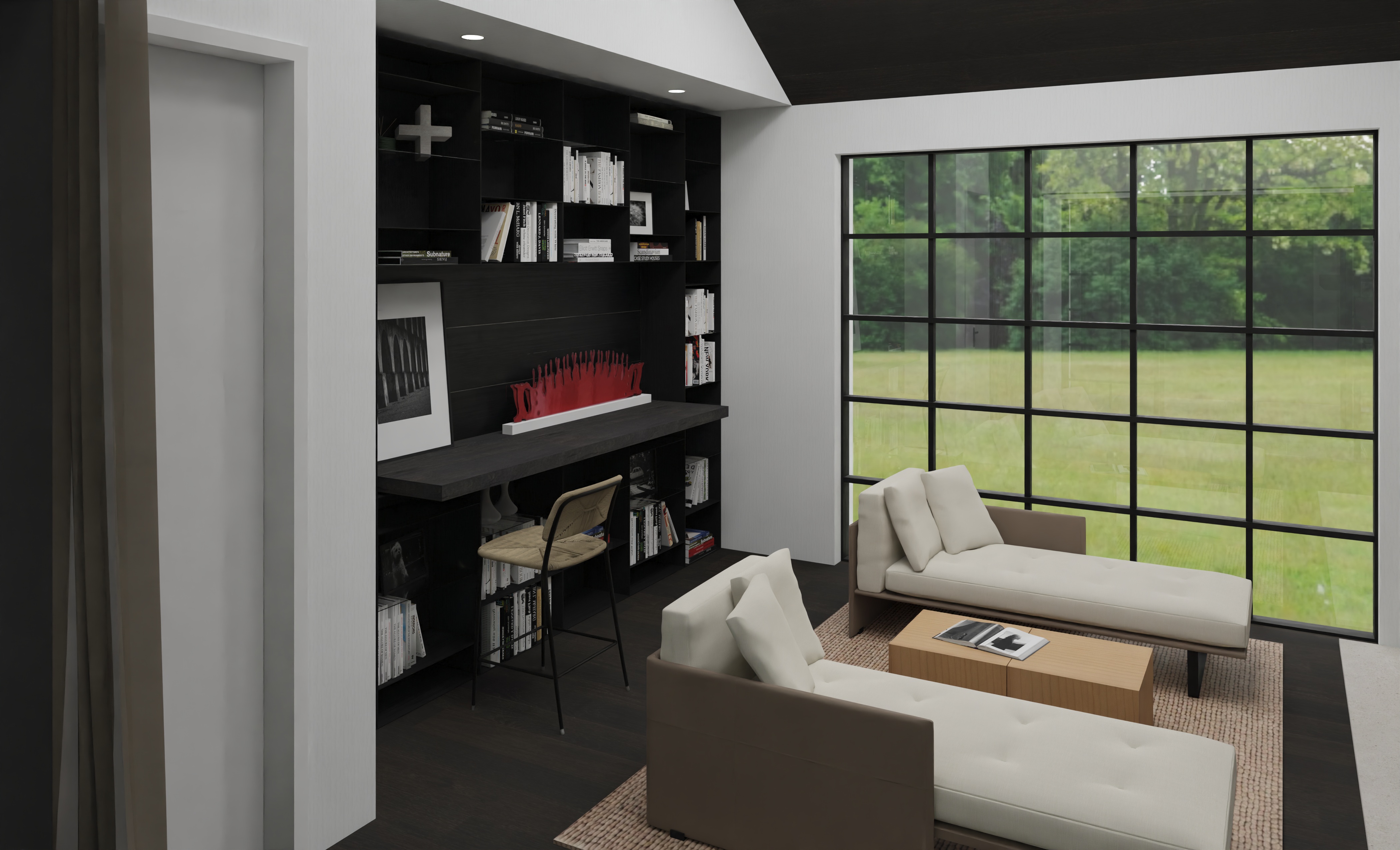 a modern minimalist library design dark oak flooring and matching ceiling complements black wood cabinet that have no lighting within them with a matt black fossil wood desk top and soft seating the design the atmosphere is calm and relaxing accented by lush green hydrangea plant outside the window with lighting that is soft and natural creating a relaxing atmosphere