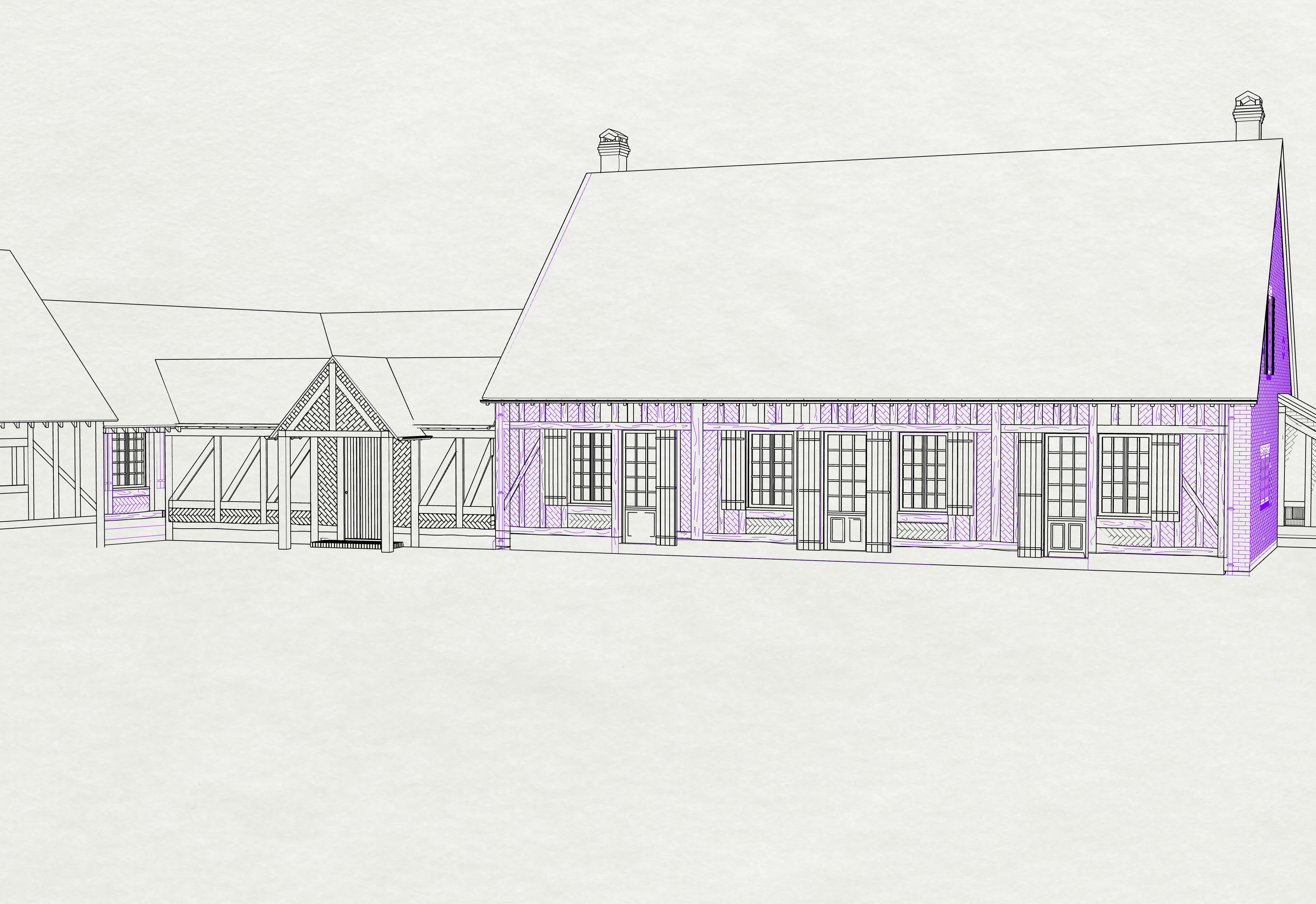 an existing building on the right and the proposed extension to be built on the left continuing along the line of the existing structure the existing building features a roof covered with flat clay tiles dark in tone slightly weathered over time with some moss two brick chimneys and a continuous gutter running along its entire length very dark aluminum tone aged over time the fa ade of this building is made of clay bricks a mix of reddish orange tones shaded with brown and violet hues sometimes tending toward pink or dark red with beige colored mortar joints the bricks are laid at a 45 angle brick dimensions length 21 cm thickness 7 cm all timber frame elements are made of dark toned old oak the windows and doors of the existing building are painted white as are the shutters the base of the building is made of concrete with a raw finish the extension continues the materiality of the existing building with timber frame elements in dark toned old oak matching the existing structure between the wooden posts glazed transparent panels are integrated without glazing beads the roof above the entrance door also features brick infill laid at a 45 angle and projects 1 40 m forward from the entrance door it is supported by two front posts the entrance door of the extension is made of solid wood dark toned old oak without glazing a brick step is placed in front of this door at courtyard level the roof is covered with flat clay tiles with a new appearance the base is finished with a white lime render surround the house with abundant vegetation in the background including tall trees native to the centre val de loire region in france the atmosphere should be calm and welcoming with soft natural light illuminating both the fa ade of the existing building and the extension small birds such as ducks can be seen flying in the sky in the background in front of the buildings a courtyard is laid out with gravel in various shades of gray no vegetation should appear in the foreground of the image