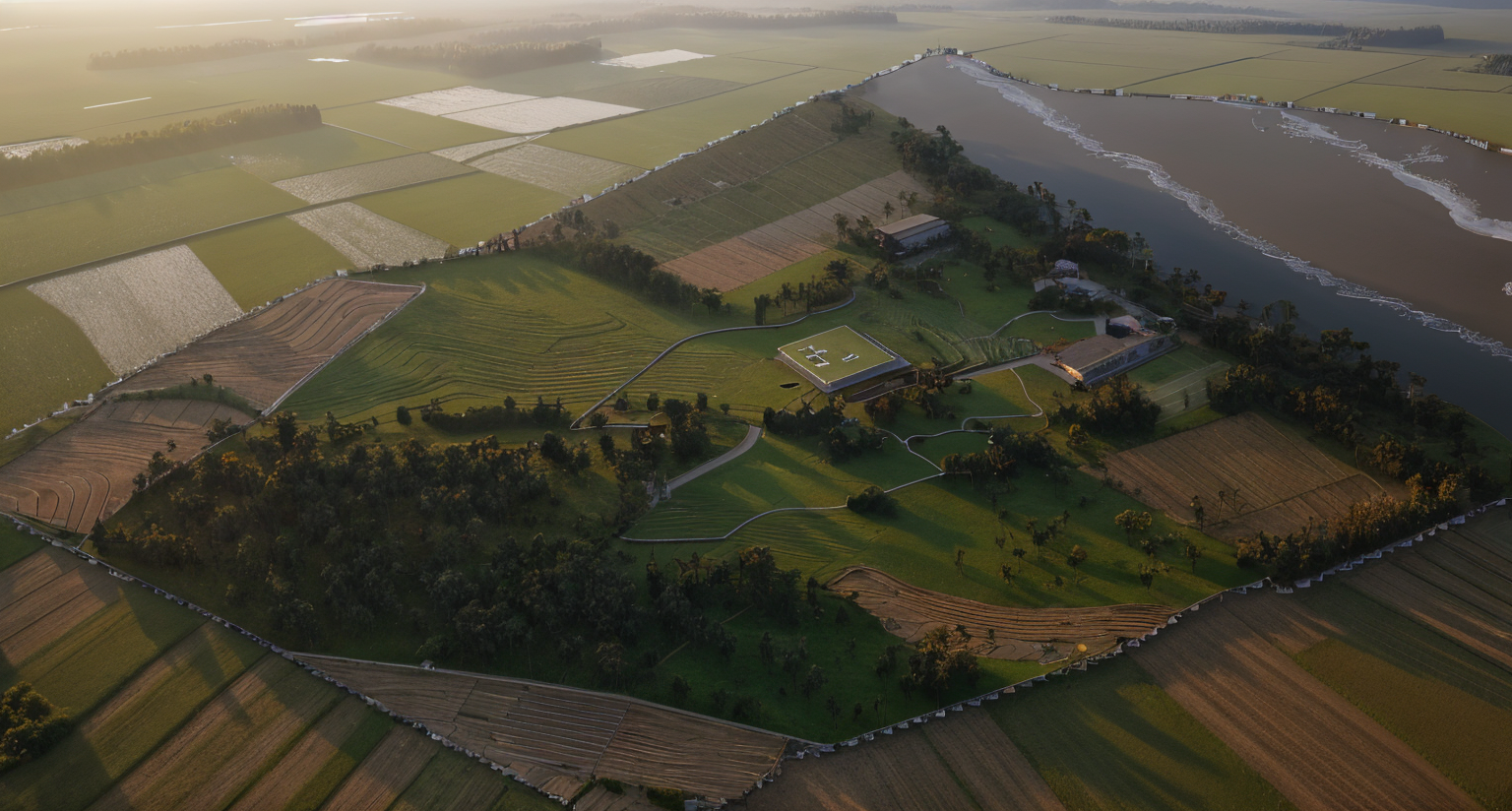 enhance the existing render result to be more realistic while keeping the composition and perspective exactly the same the render is a bird s eye view with rice fields surrounding the site refine the rice field textures with lush natural green tones organic growth patterns and subtle water reflections add warm sunlight highlighting the ridges of the terraces making the green and yellow shades more vibrant while casting soft shadows in between maintain a natural morning ambience with atmospheric depth and realism