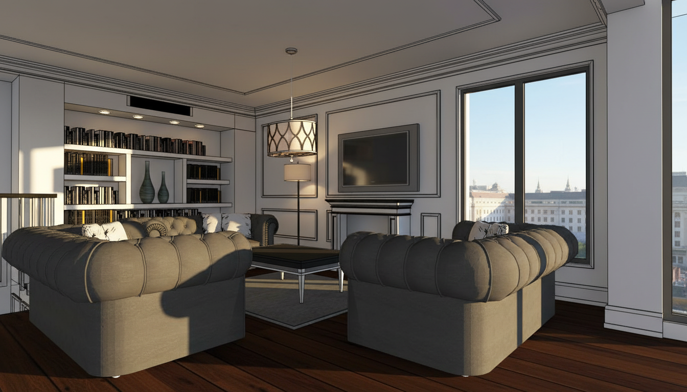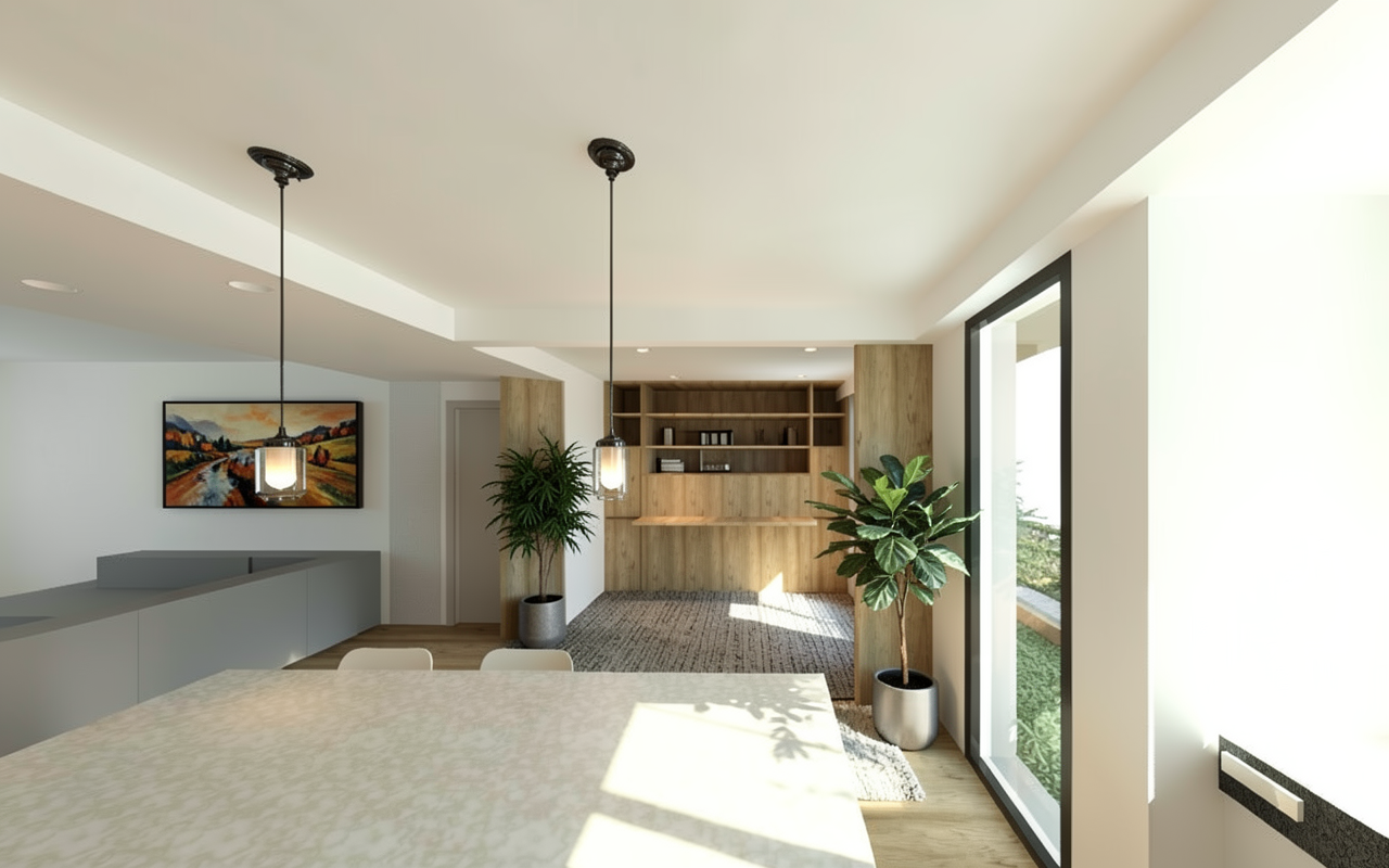 international style interior shot create a nice realistic interior visualization do not change materials maintain correct scale and proportions use physically accurate lighting with soft global illumination and high quality textures ensure precise details with realistic reflections and shadows the lamps are turned on and emit warm light with visible light sources keep natural exposure a nice view is visible through the window do not add stylization or artistic effects the result must be photorealistic withoutthe window sun reflection from the left do not change anything more light sun reflection on the left on the right are window architecture