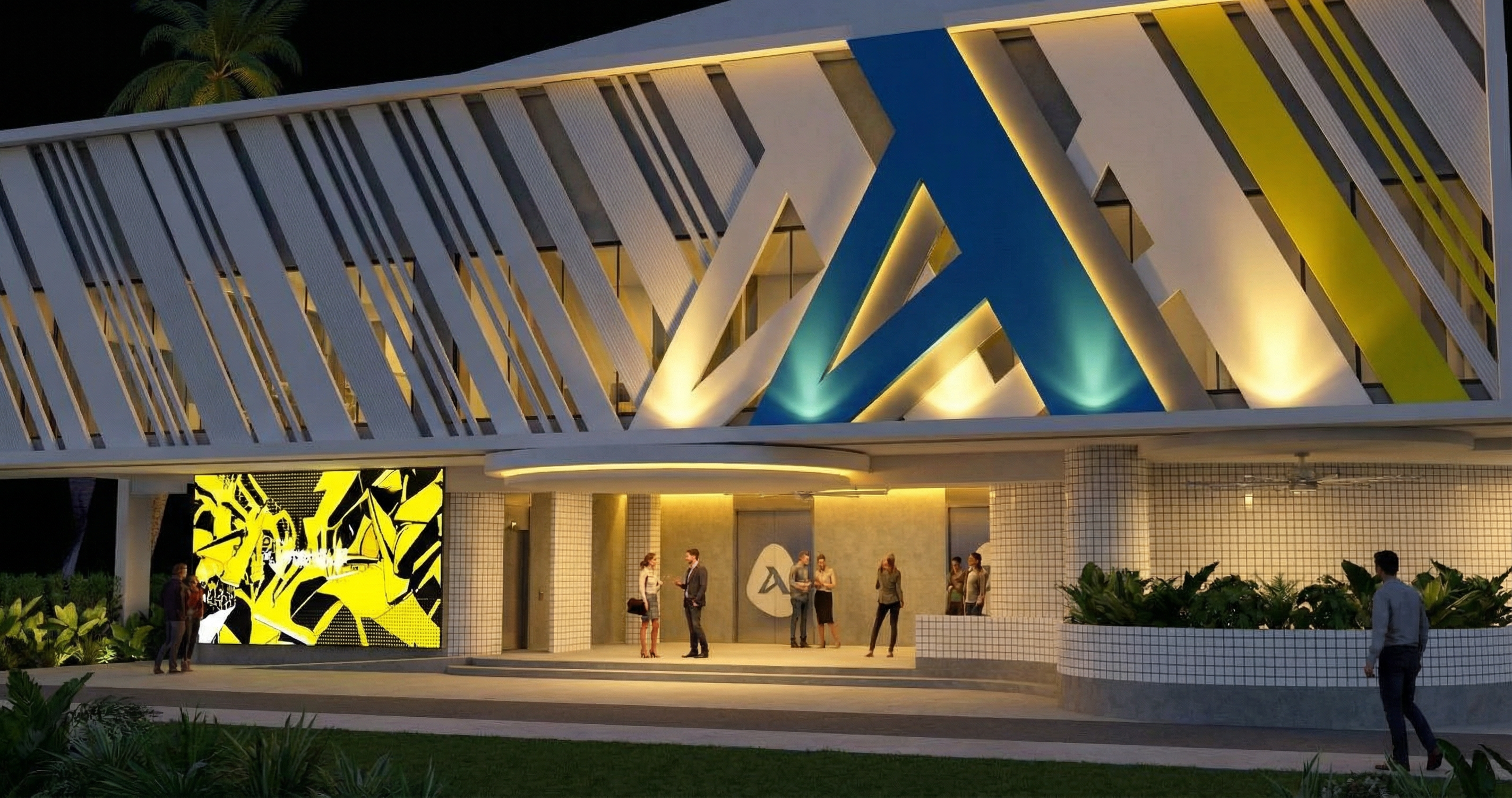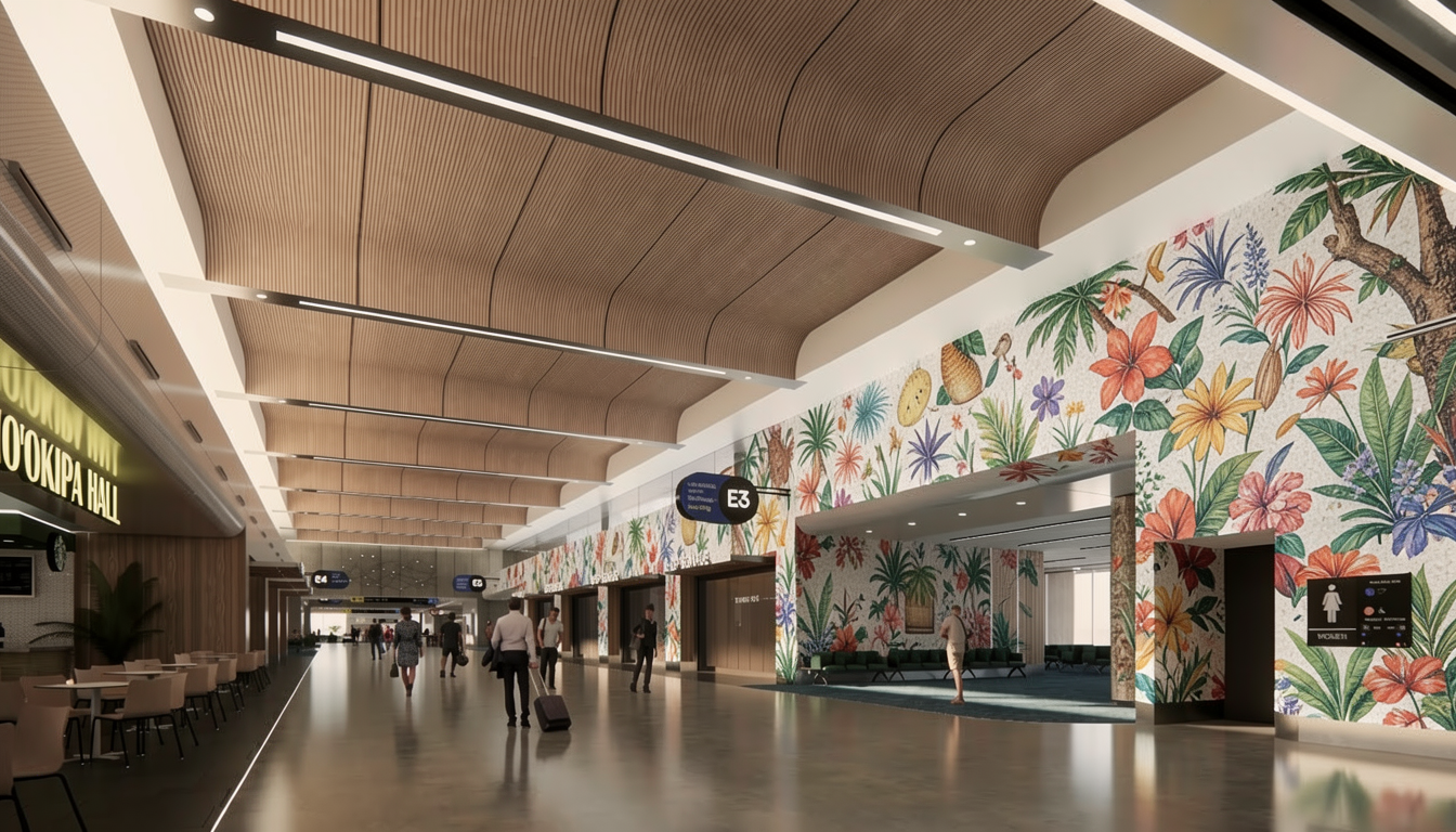 add hawaiian geometrical mosaic art which is using white and shades of green on to the white wall and fascia