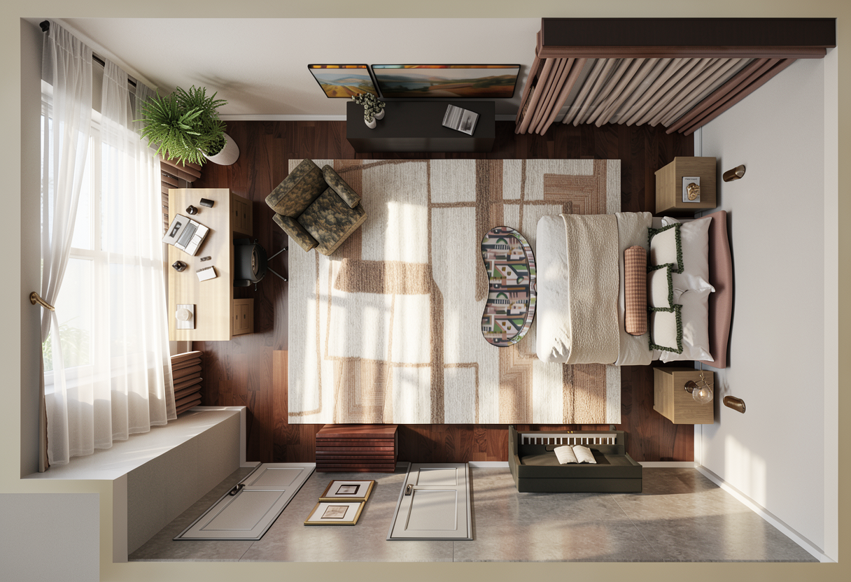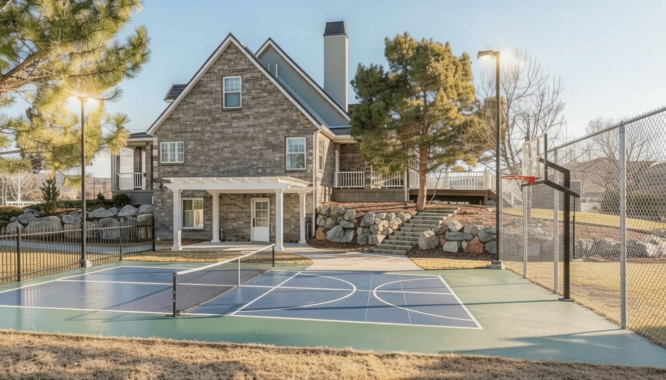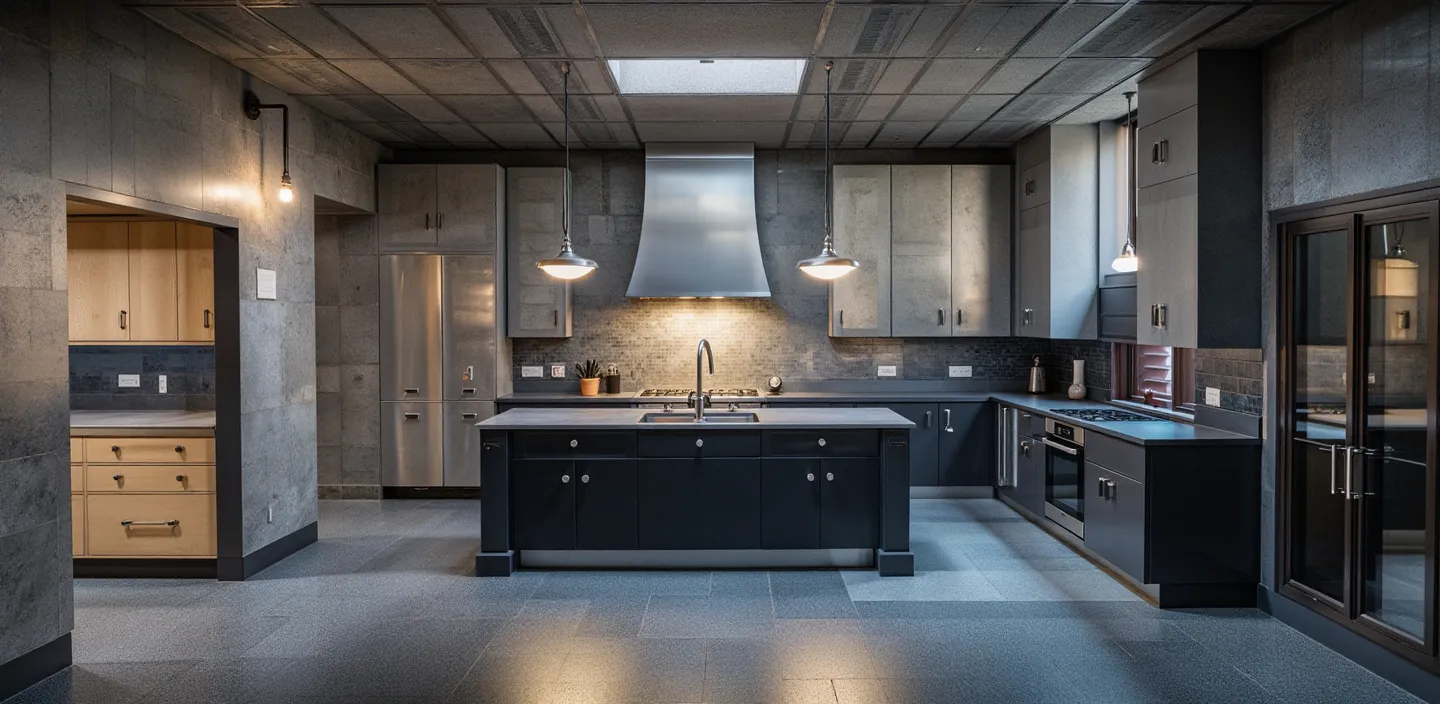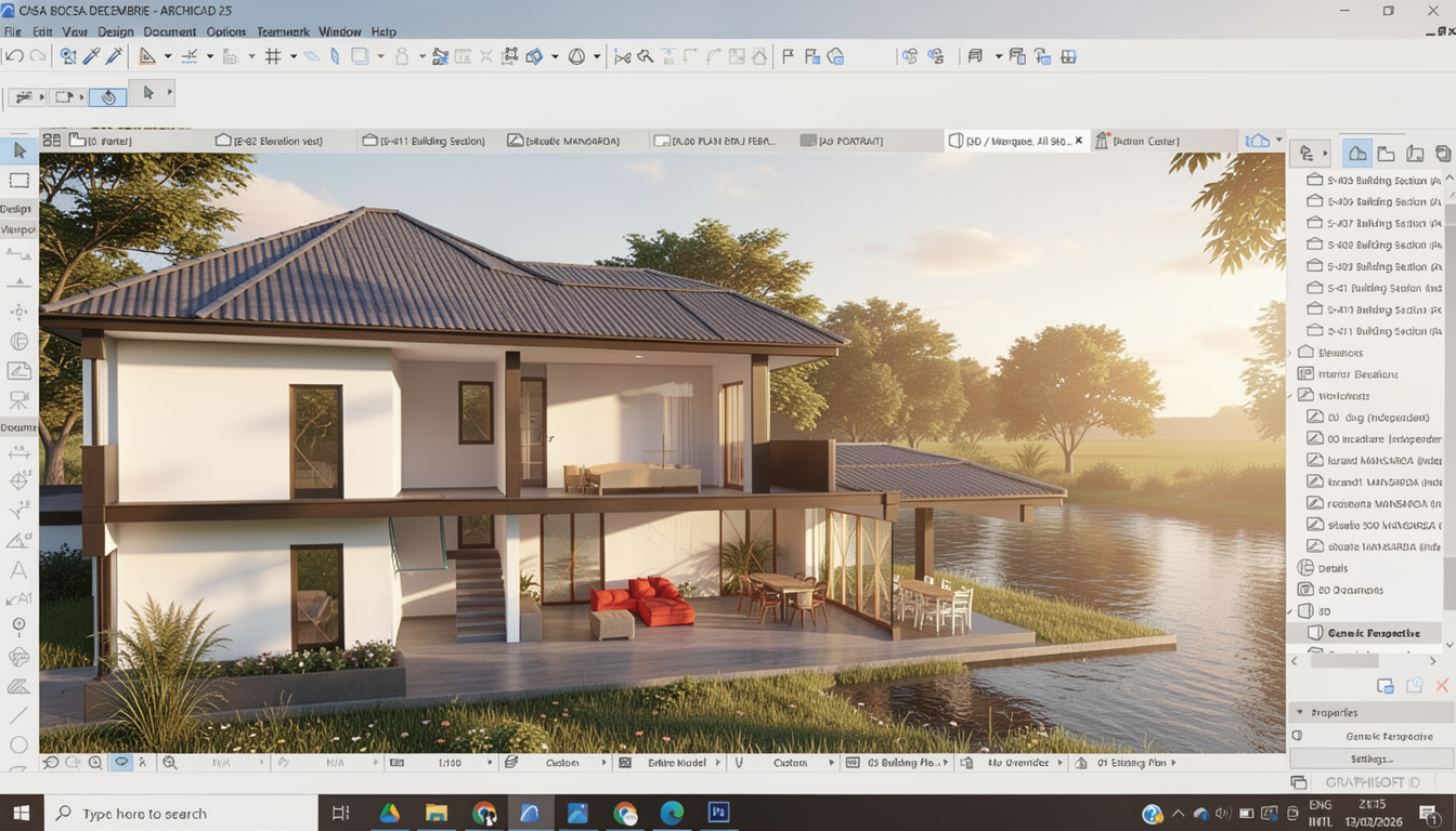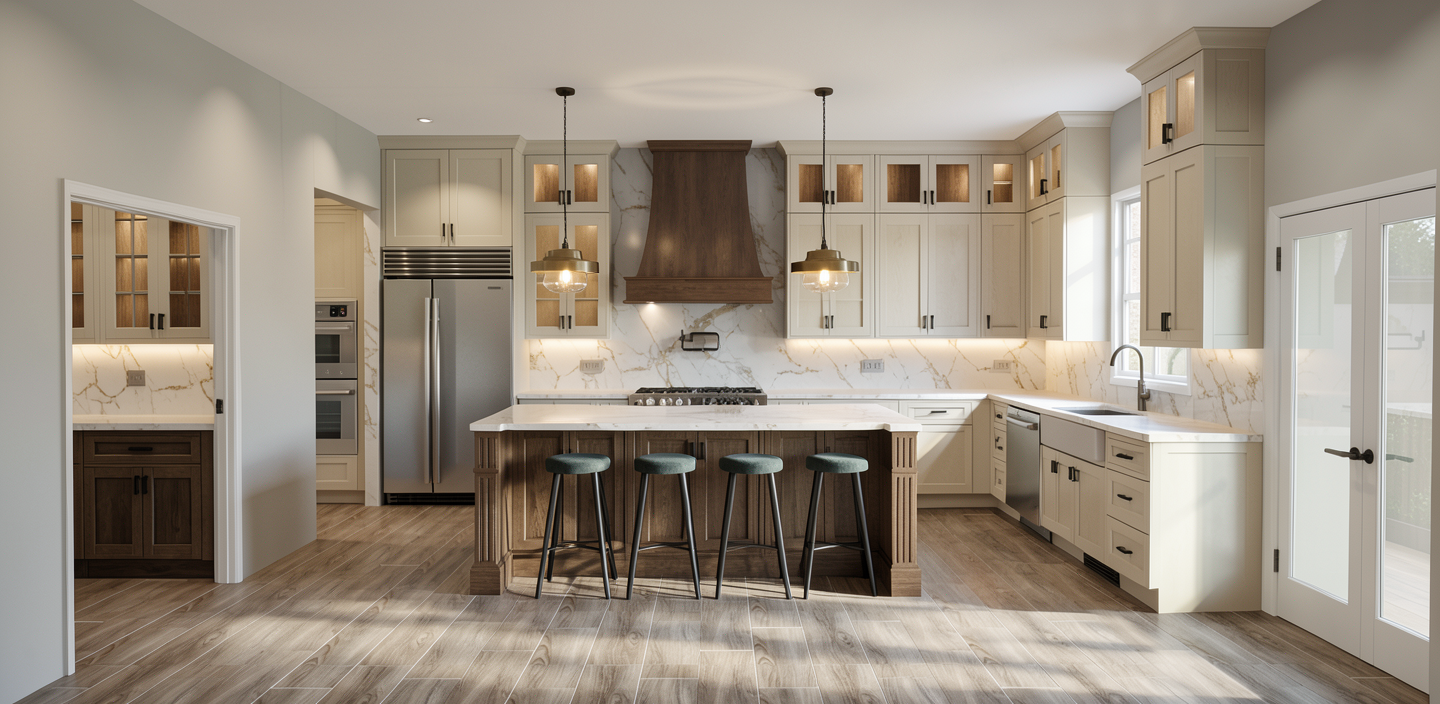 create a hyper realistic image from this kitchen renderings cabinets are a muted fern green countertops and backsplash are soapstone wooded view through the windows with sunlight streaming in do not alter the cabinet layout or details reclaimed wood beam on the hood and reclaimed wood shelves in the pantry