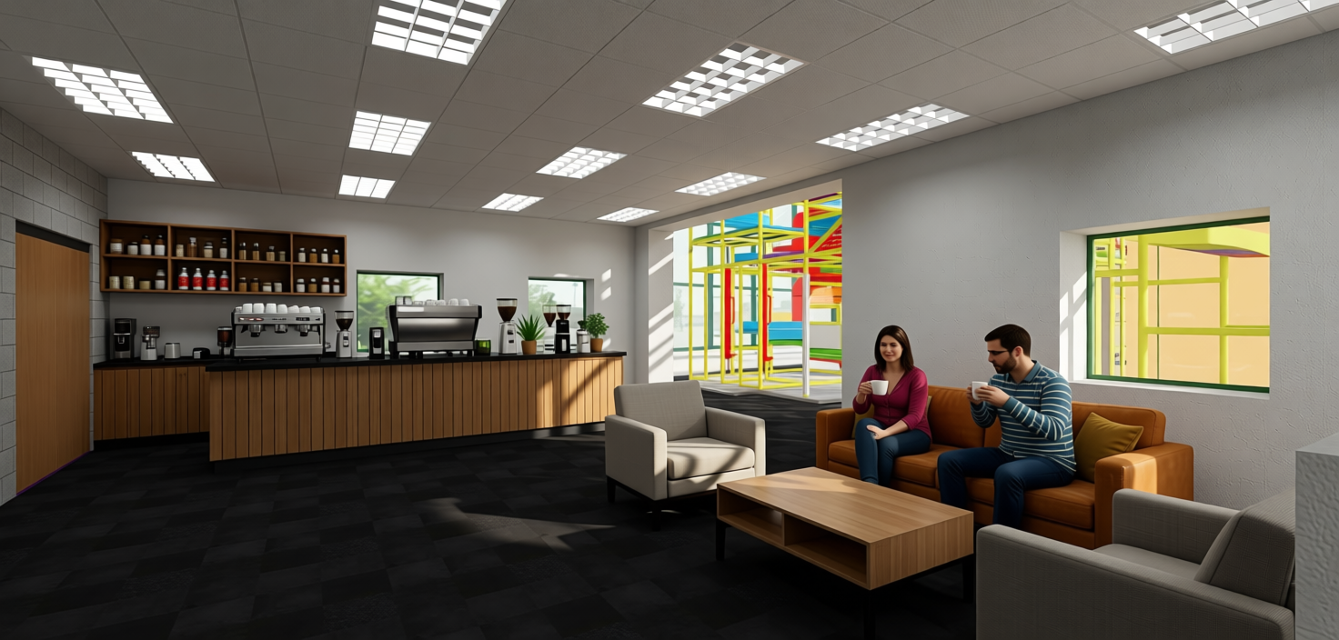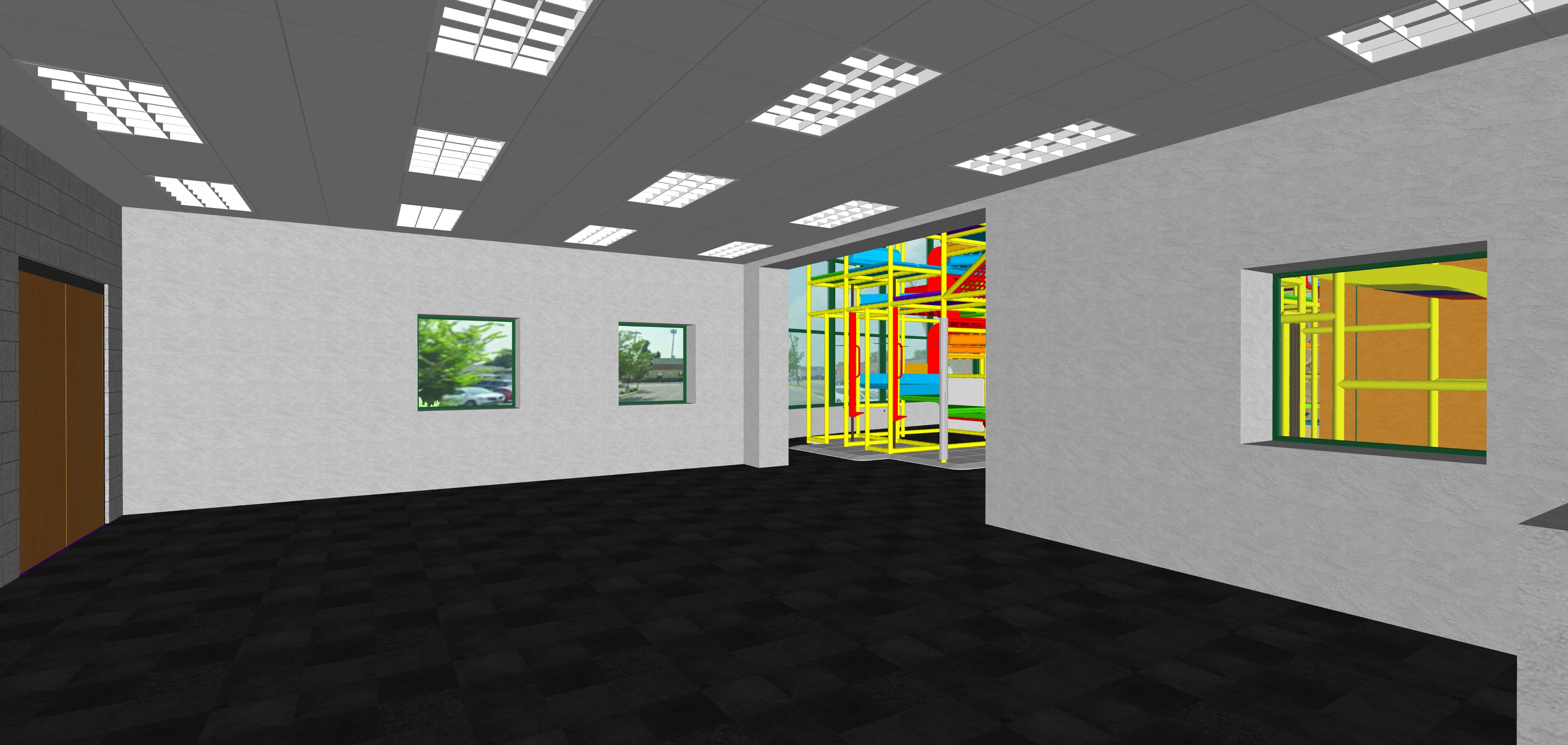 add lounge with small coffee station left of windows and parents sitting in furniture drinking coffee looking through opening in wall to indoor playground add some kids