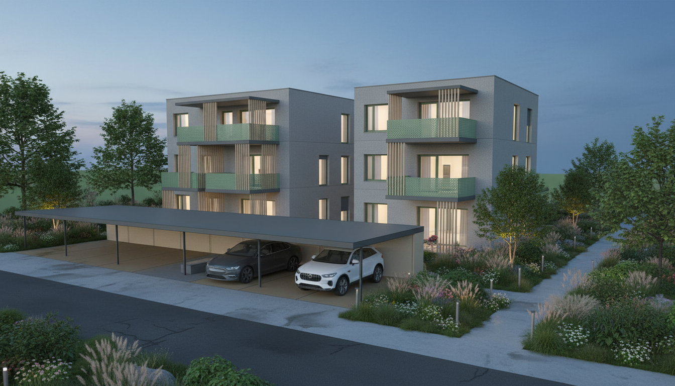add afternoon sunset lighting add parking lot in front of hotel no change in building