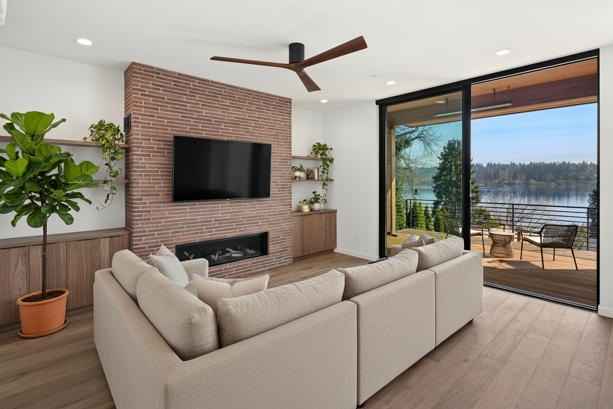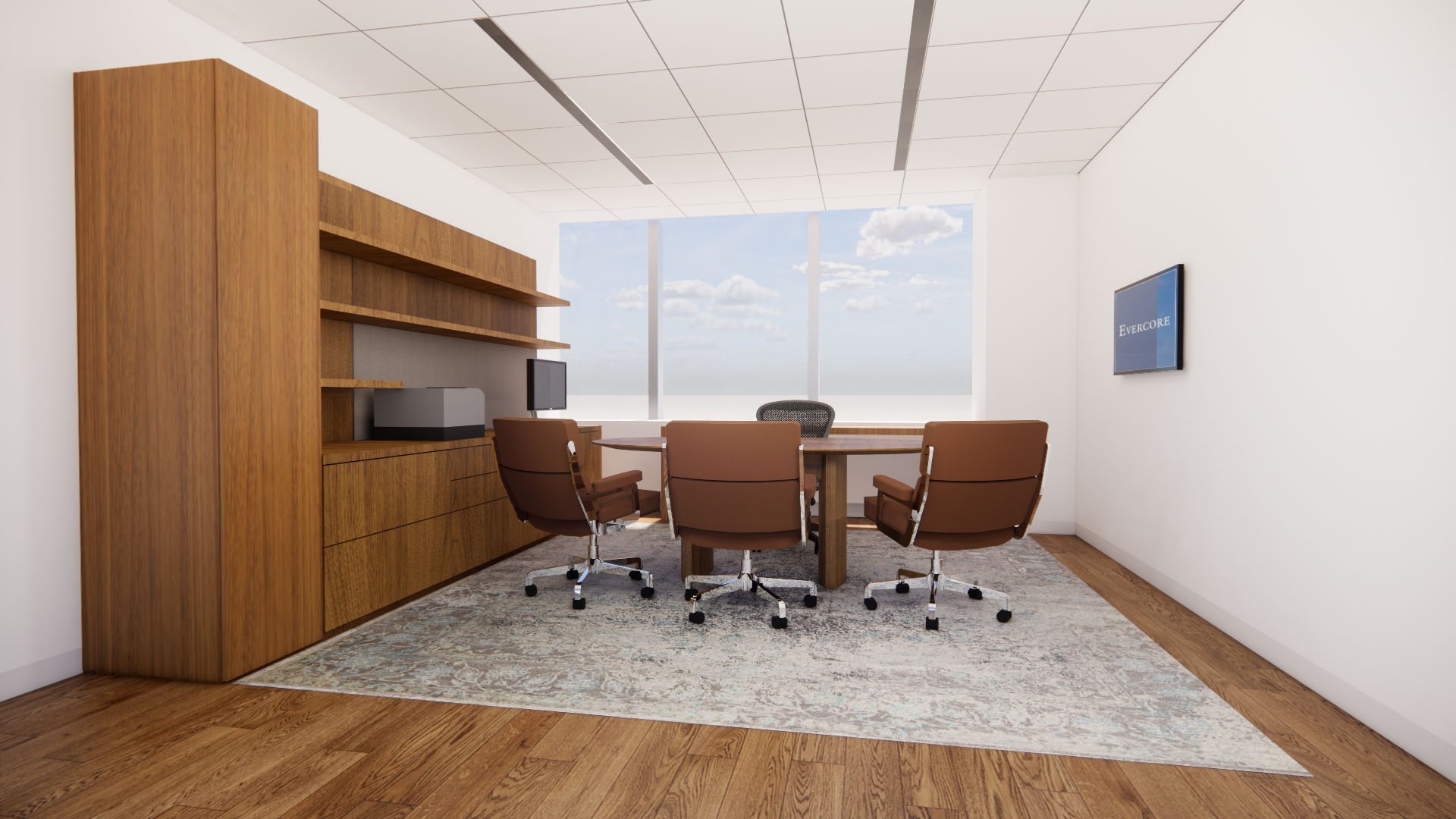 create a photorealistic rendering add midtown new york views from the 43rd floor keep all the elements proportions and finishes as they are add books and a plant on the shelves turn on the linear lights in the ceiling