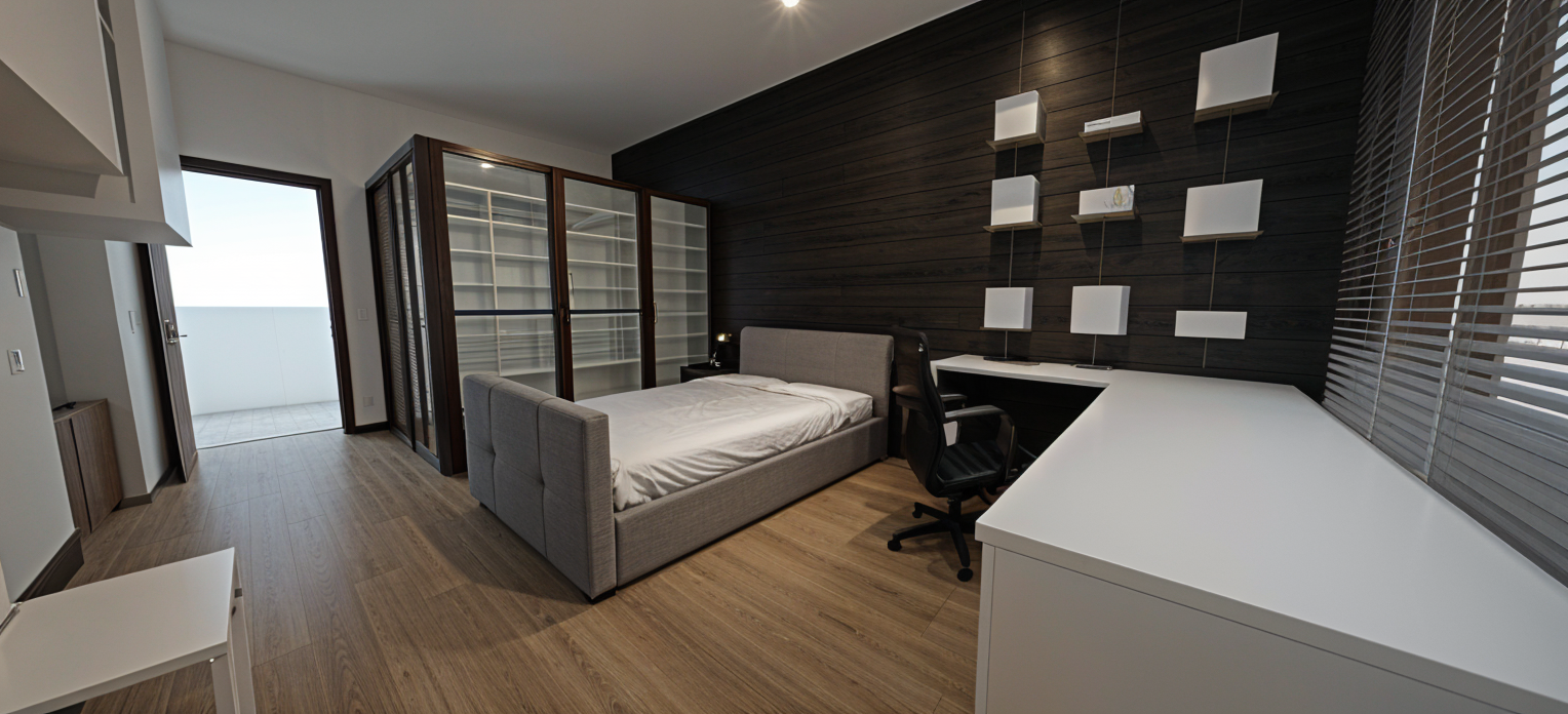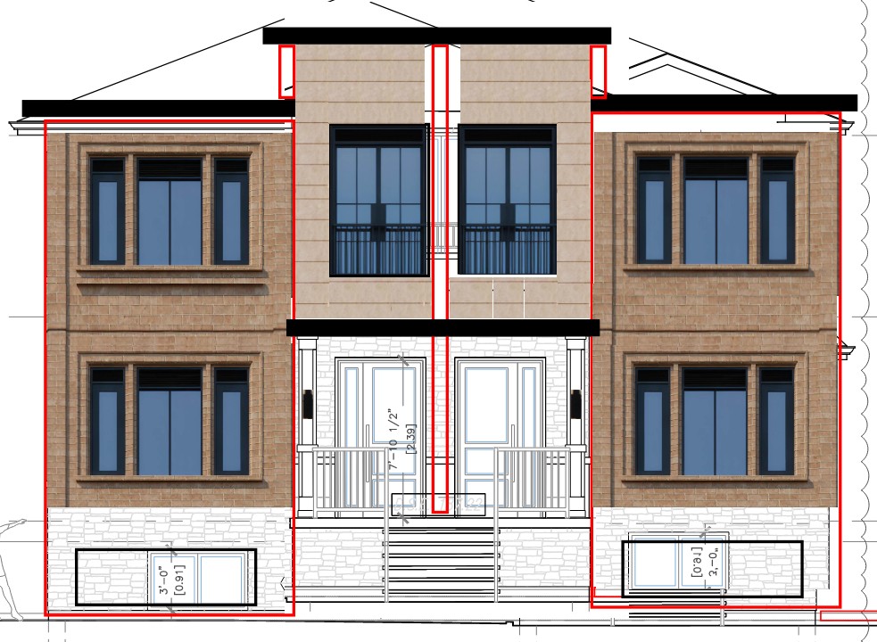 exterior shot create a highly realistic rendering of the house with limestone and wheat color brick and black glazing